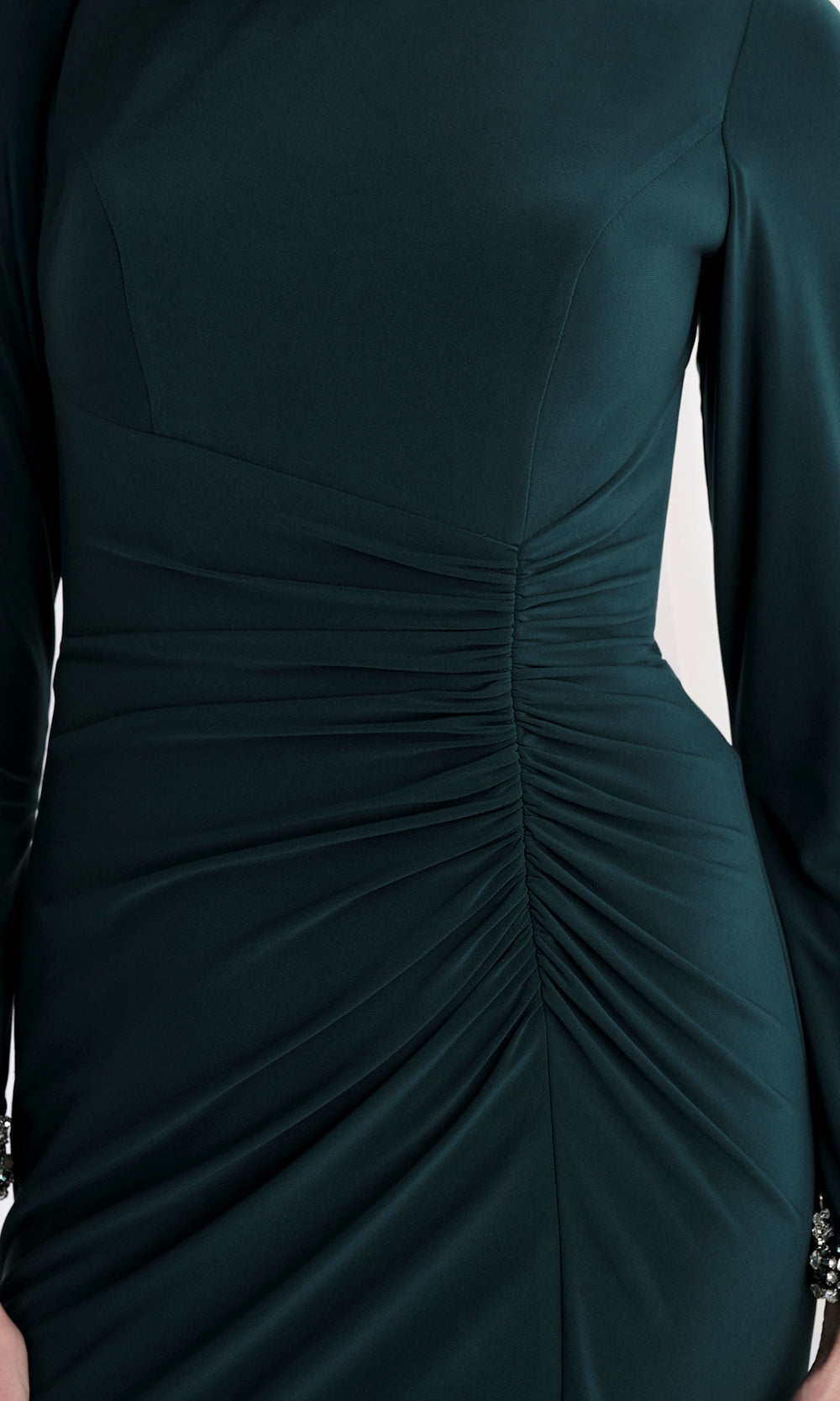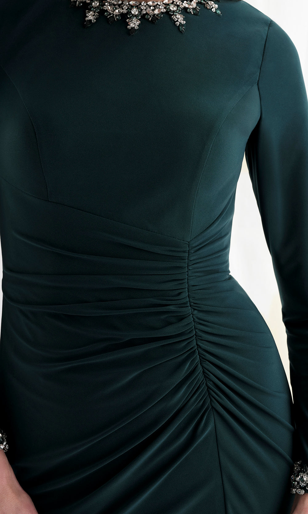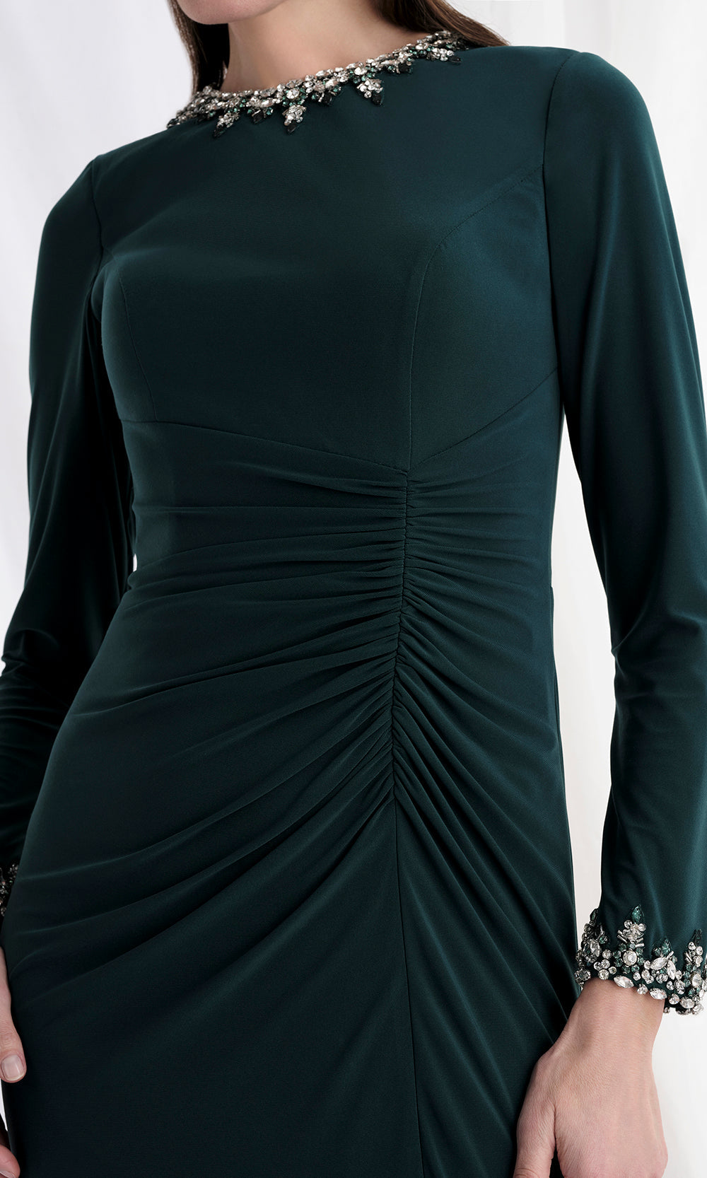 Every moment feels elevated with MGNY By Mori Lee 73166 enhancing your presence. The jersey material flatters while intricate beadwork adds visual intrigue to the jewel neckline and cuffs. Carefully ruched and gentle side gathering shape the figure without compromising comfort. Its long sleeves and sleek profile maintain a graceful allure from every angle. For timeless appeal and understated drama, MGNY By Mori Lee 73166 sheath gown is an impeccable choice for memorable occasions. Model is wearing Emerald color.