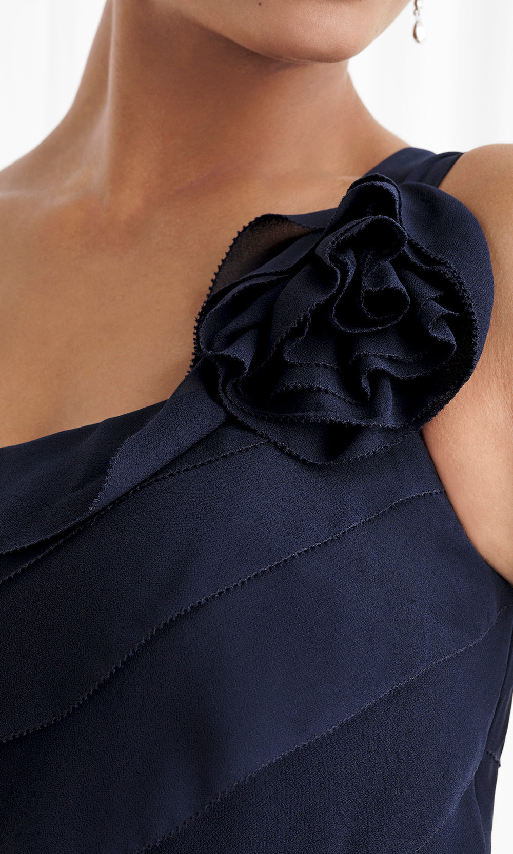 Confidence meets elegance in a MGNY by Mori Lee 73173 gown created to highlight your best moments. The one shoulder neckline creates asymmetrical balance, further elevated by a 3D floral accent resting at the shoulder. The tiered design enhances the movement of the flowing A-line skirt, making it ideal for formal settings. A natural waistline ensures a comfortable yet structured fit. MGNY by Mori Lee 73173 embodies sophisticated elegance and is a wonderful choice for creating a memorable impression. Model is wearing Navy color.