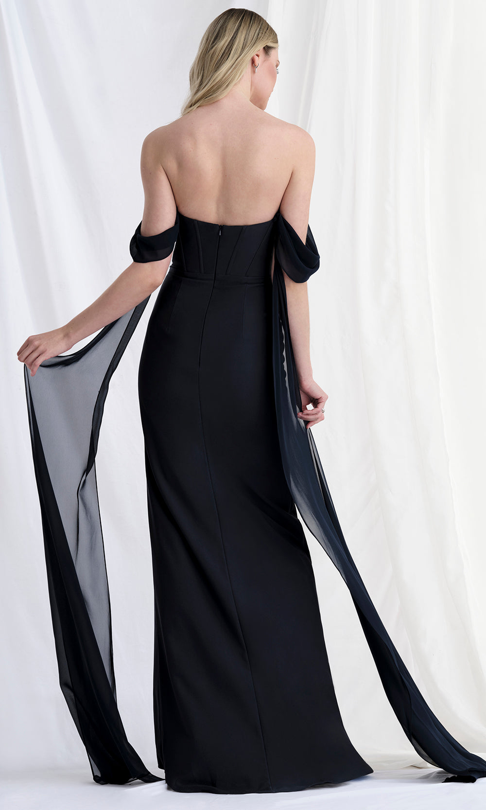 Details: Off Shoulder Sleeves, Chiffon Streamers, Beaded, Corset Boning Bodice, High Slit, Fitted