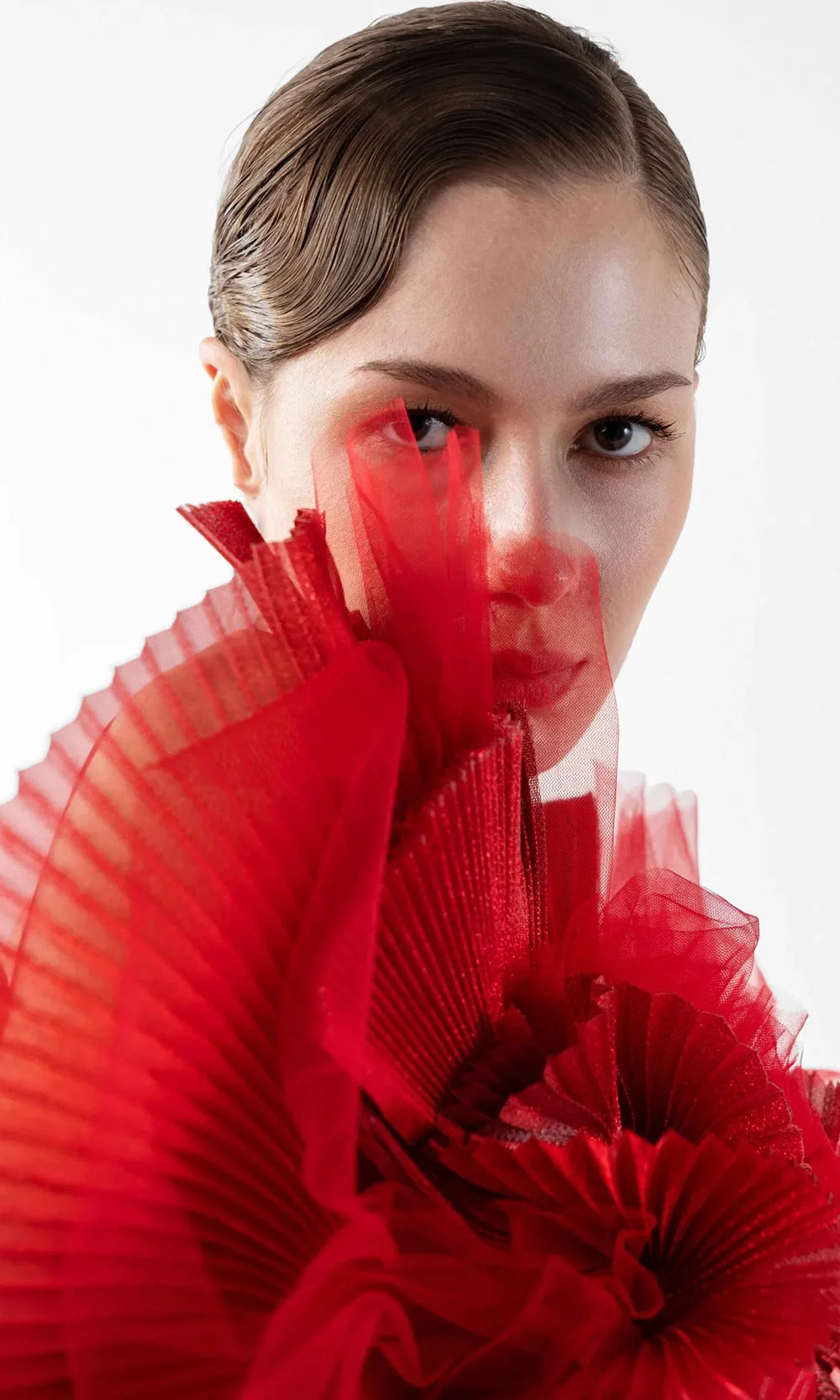Defined by its captivating silhouette, this MNM Couture G2001 gown offers a refreshing take on evening glamour. The bodice is styled with pleated organza and draped tulle in sculptural asymmetry, topped with a sleeveless bateau neckline. A sleek, sheath skirt flows effortlessly into a refined train, ensuring movement remains graceful. The design embraces couture sensibilities, delivering modern drama without overwhelming the wearer. Whether admired from the front or as you walk away, MNM Couture G2001 leaves a lasting impression through its artful structure and impeccable design. Model is wearing Red color.