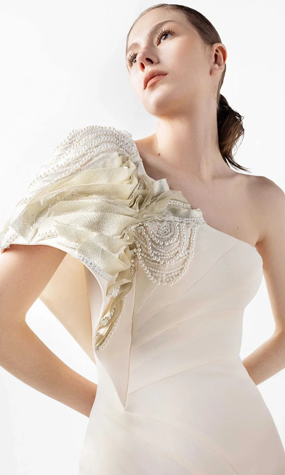 Simplicity becomes the standout feature in this MNM Couture G2003 refined and sleek creation. The ensemble brings elegance to the forefront with a structured asymmetric neckline and a one shoulder puff sleeve embellished with pearl embroidery. Its tailored mermaid silhouette flatters the natural waist and elongates the body with ease. Perfect for formal occasions that call for understated sophistication, this gown makes every detail count. Elevate your evening with the MNM Couture G2003 design that merges modern form with graceful presence. Model is wearing Cream color.