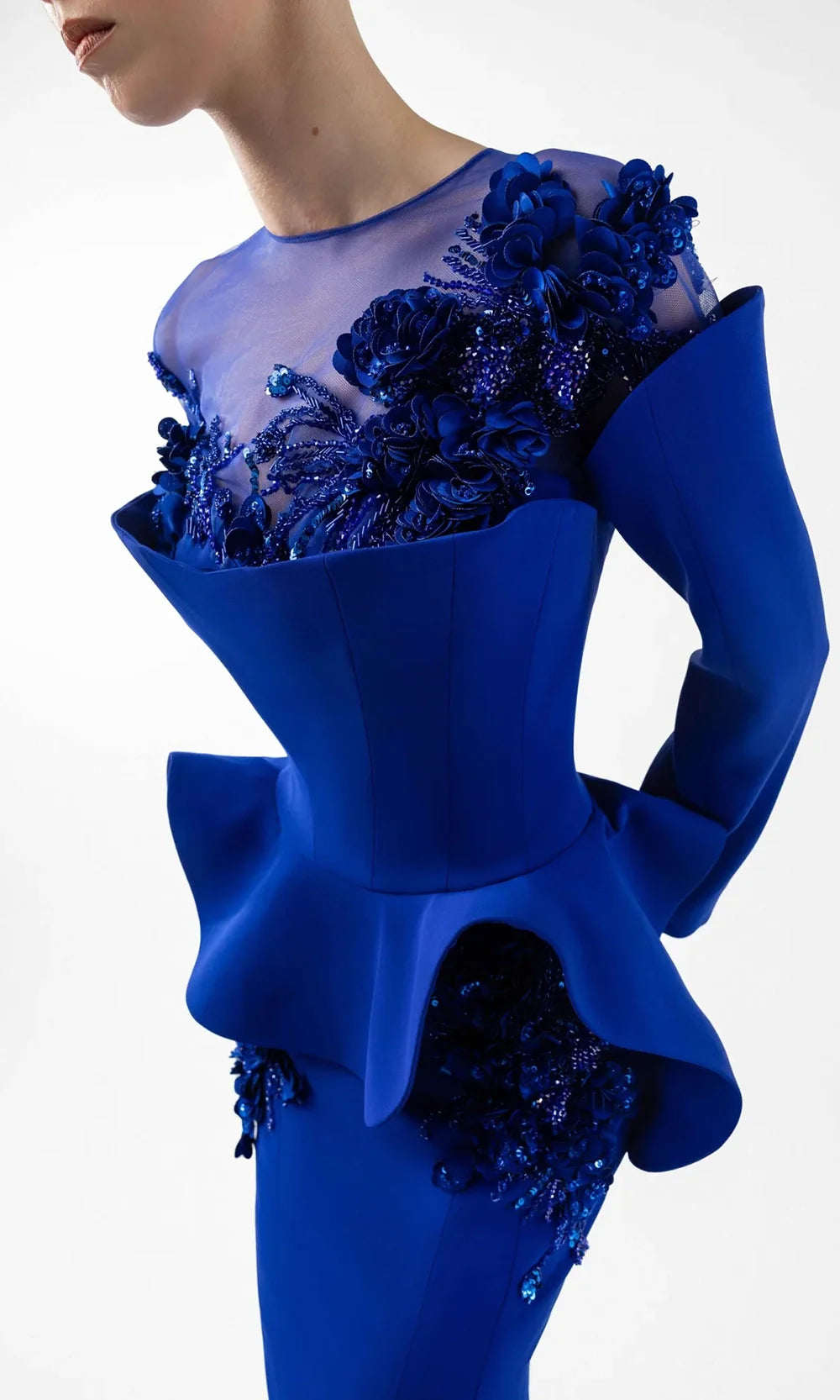 Striking structure and refined embellishment merge in the MNM Couture G2029 long gown that commands the room with elegance. The illusion jewel neckline contrasts with the dense beadwork and handmade embroidery, while a precise peplum creates sculptural volume at the waist. Long sleeves enhance its poised appeal, and the sleek mermaid silhouette completes the look with graceful proportion. MNM Couture G2029 is the ideal choice for those who embrace elegance with a couture twist. Model is wearing Royal Blue color.