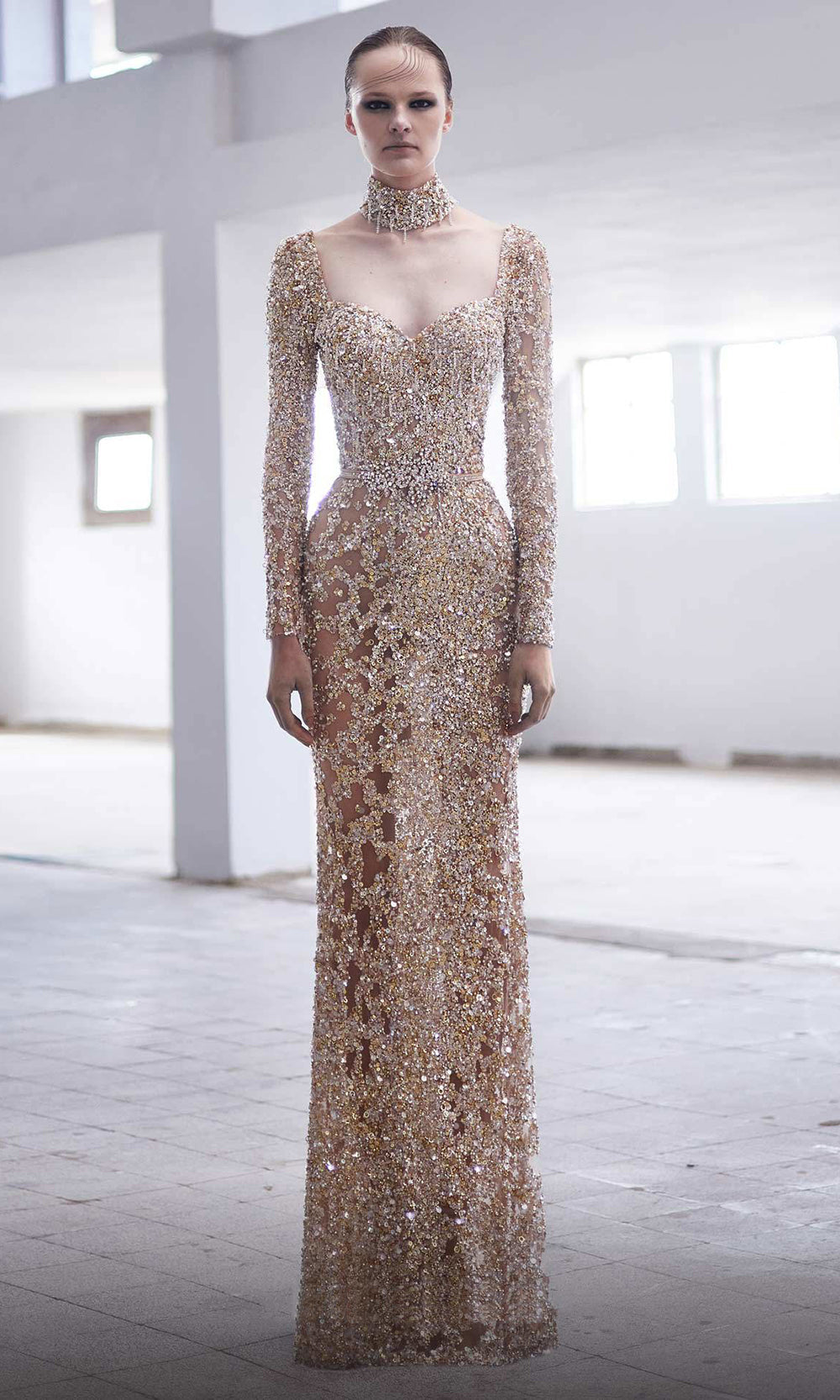 Embodying sophistication and glamour, this MNM Couture M1017 gown stands as a testament to the artistry of couture fashion. The form-fitting sheath silhouette accentuated by a sheer overlay enhances the wearer frame while allowing intricate beadwork to take center stage. A sweetheart neckline creates a powerful and refined aesthetic, complemented by long sleeves and choker for an air of mystery. Every embellishment catches the light, producing a captivating sparkle from every angle. The MNM Couture M1017 is the ultimate gown for those who appreciate craftsmanship, drama, and undeniable elegance. Model is wearing Gold color.
