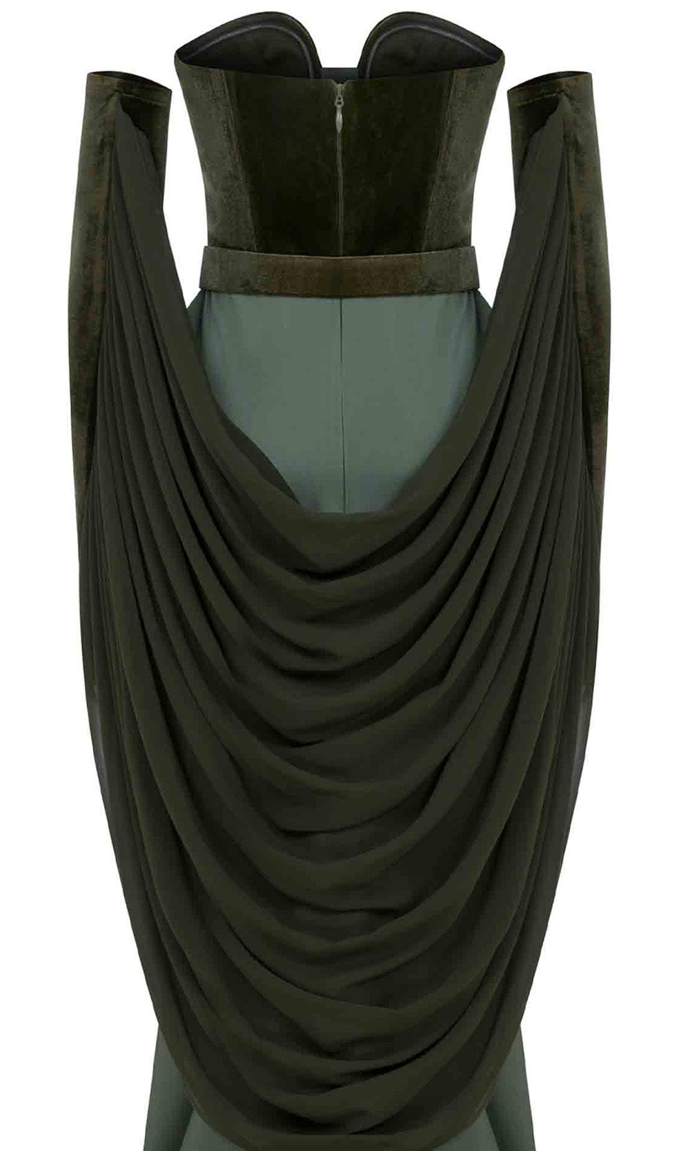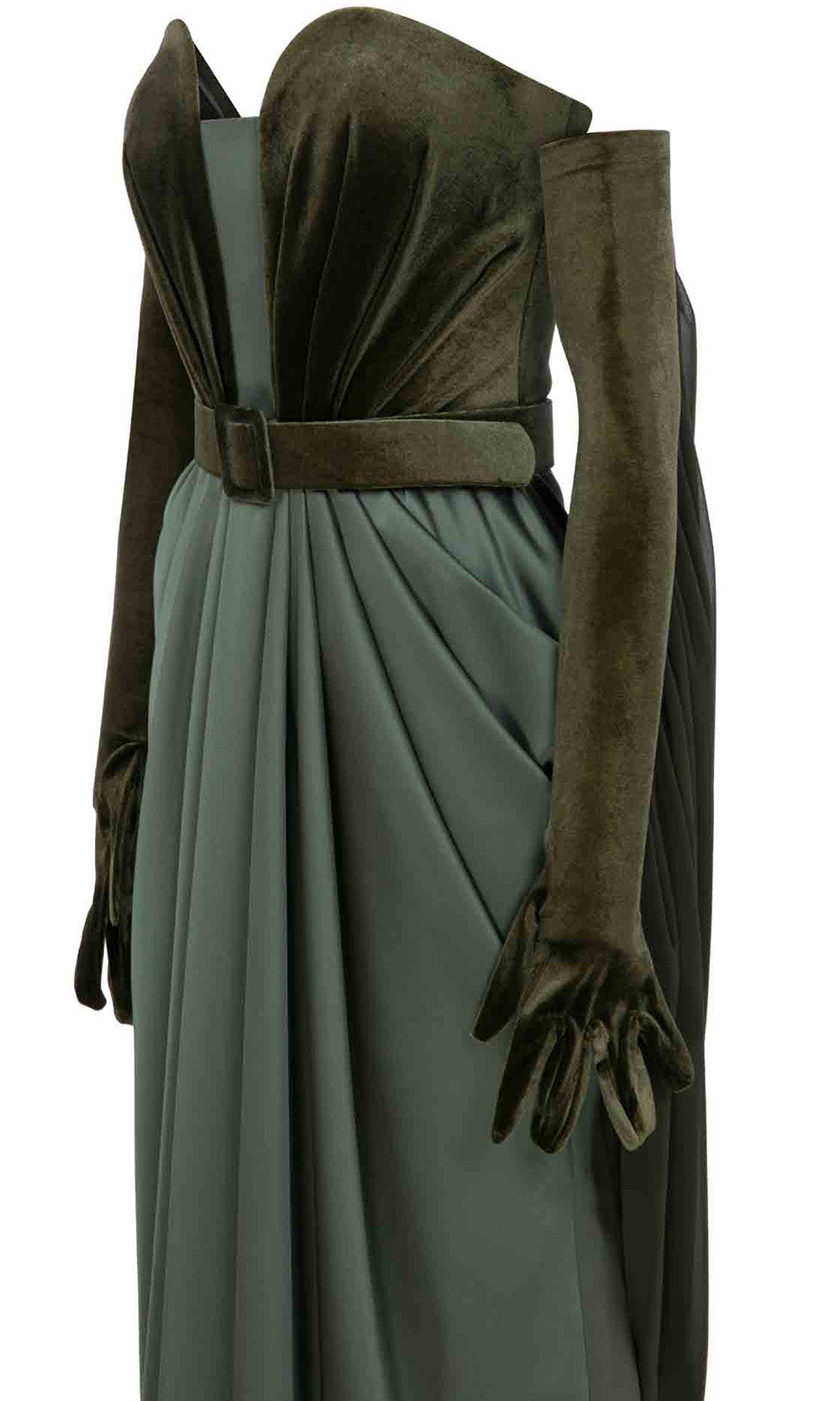 Details: | Strapless, Belted Waist, Draped Skirt, Gloves With Cape Effect, Sweep Train |