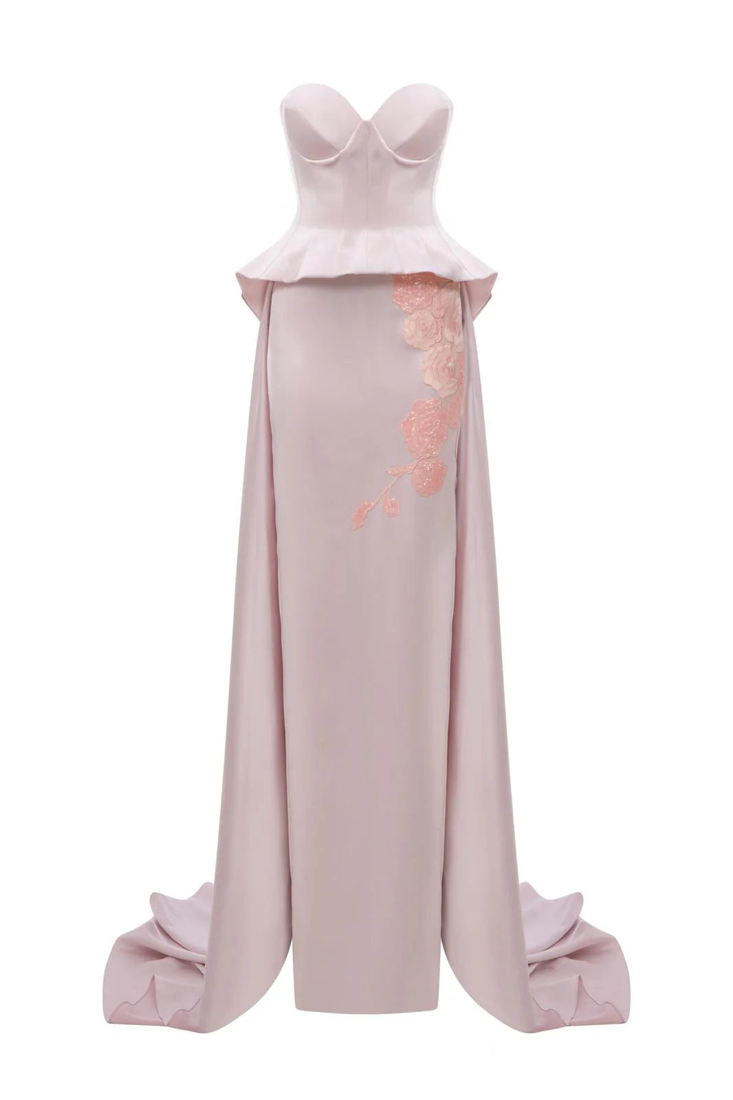 Details: Strapless, Peplum Waist, Corset Top Bodice, Floral Beaded, Embroidery, Pleated Overskirt
