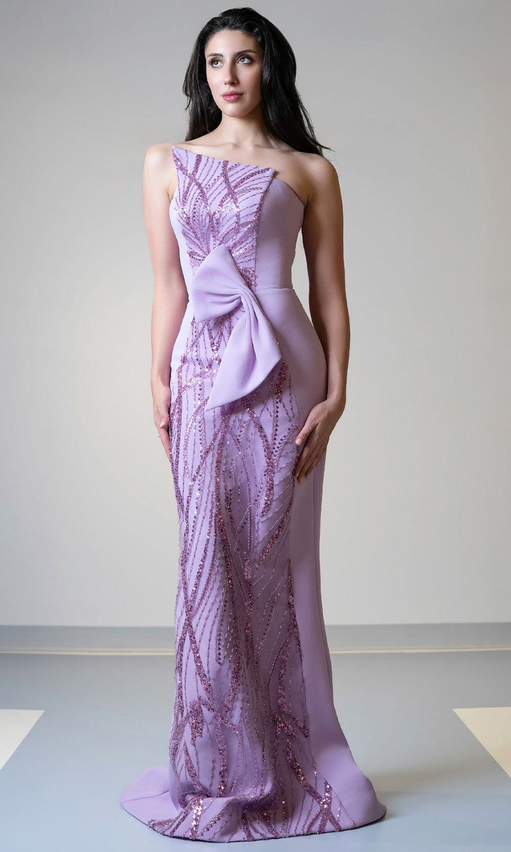 Step into sophistication with the MNM Couture V07512, a gown that beautifully balances glamour and artistry. The strapless asymmetric neckline frames the shoulders with understated elegance, while intricate beaded embroidery and sequin adds a captivating sparkle. An oversized bow detail at the waist serves as the perfect statement accent, drawing the eye to the figure-hugging column silhouette. Ideal for formal galas or upscale weddings, the MNM Couture V07512 promises to make you the center of attention wherever you go. Model is wearing Purple color.
