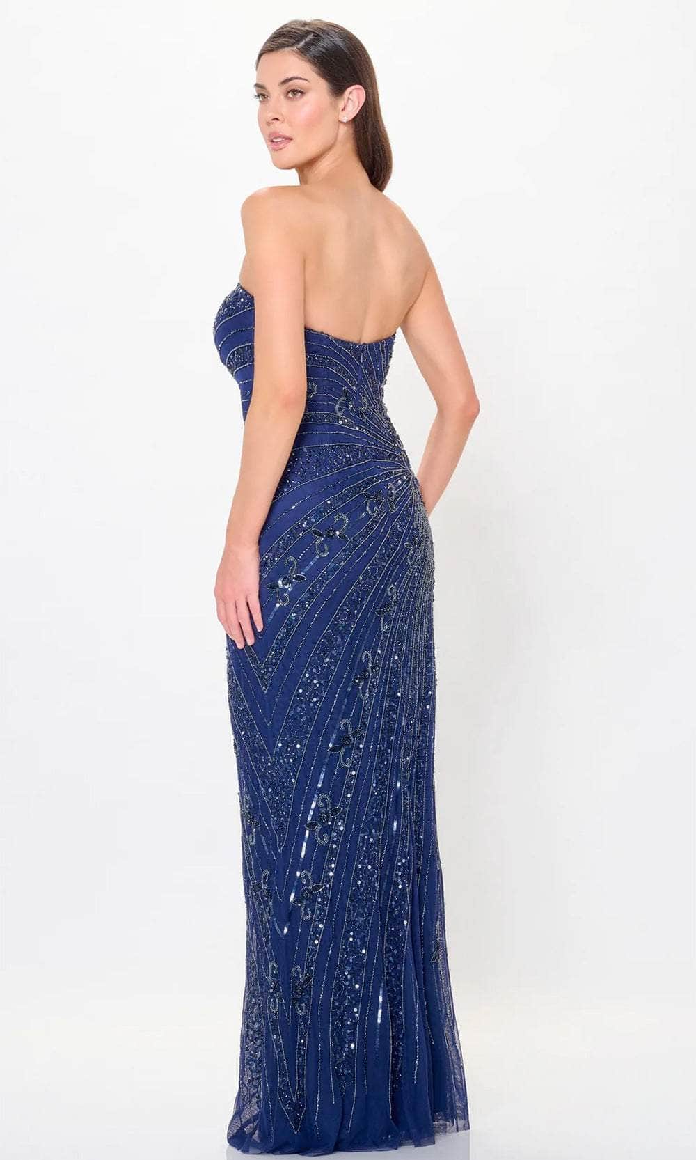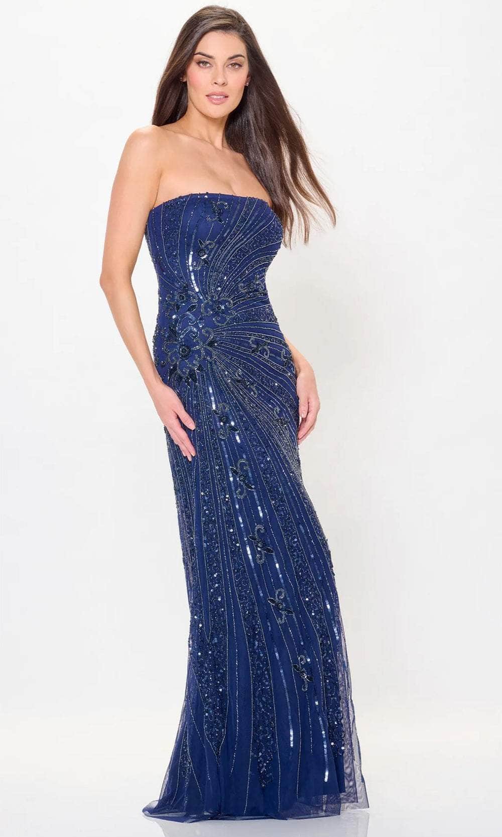 Own the night in the Montage by Mon Cheri M909 creation. This stunning sheath gown is a guaranteed showstopper. Shimmering beadwork and sequins adorn every inch of the dress, creating a dazzling, light-catching display. The strapless sweetheart neckline flatters your shoulders and collarbone, while the midrise back adds a touch of sophisticated structure. The skirt flows effortlessly into a floor-length hem, ensuring you move with grace and confidence throughout the evening. This Montage by Mon Cheri M909 masterpiece redefines elegance and empowers you to radiate confidence on your special night. Models are wearing the Bronze and Navy Blue colors.