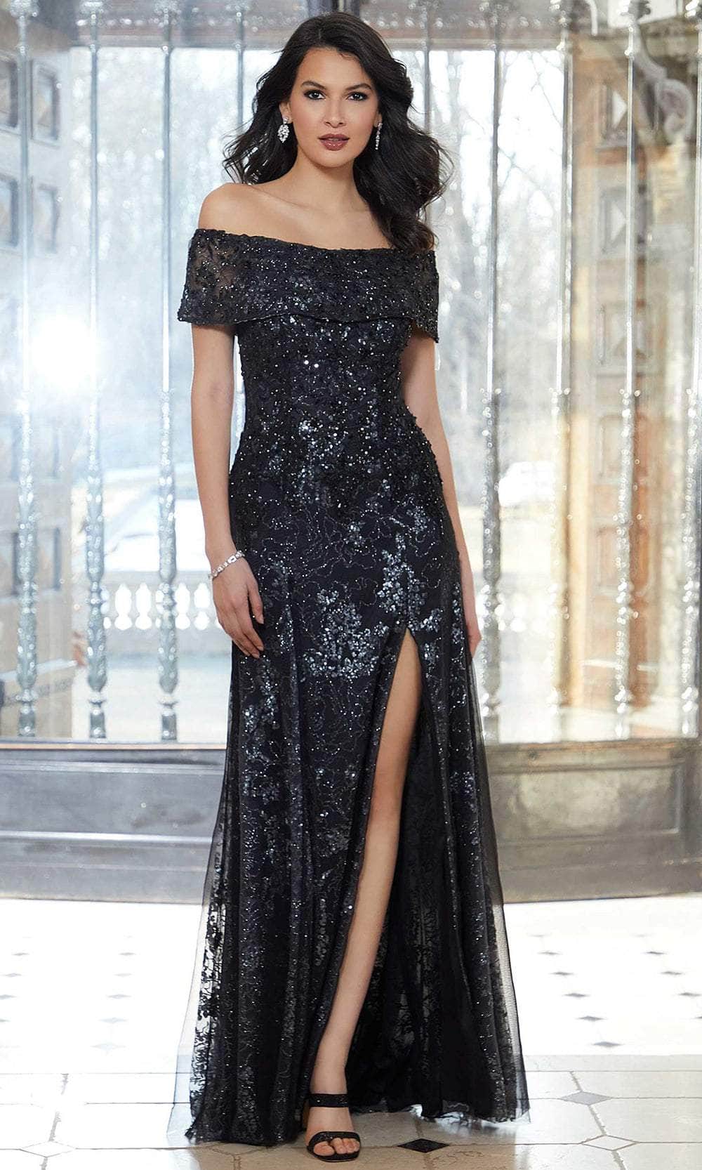 Embrace an immaculately sultry style as you glam up for your event in this Mori Lee 72606. Beaded lace appliques add glitter to the net fabric of this gown, which also includes an off-the-shoulder neckline and a fitted bodice. The slit in the front of this sheath skirt goes all the way to the floor. Step into the spotlight in this stellar gown by Mori Lee 72606 creation. Models are wearing Black and Slate colors.