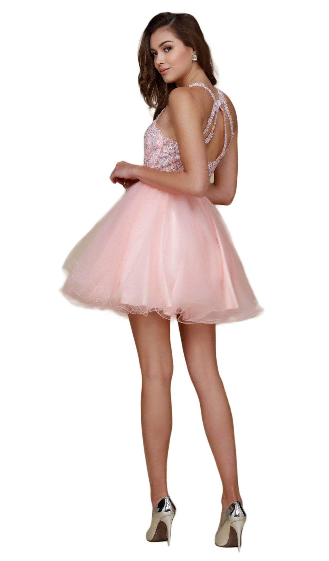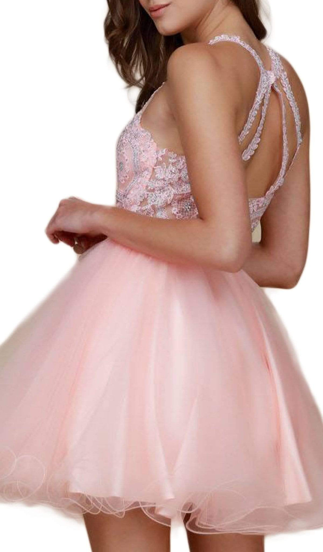 This short, fit, and flare dress is beautifully designed with embroidered lace applique sleeveless bodice embellished with sparkling rhinestone beads. Leafy lace beaded string circles around the jewel neckline and frames the caged back giving the dress lovely interesting details. Layers of frothy tulle make up the short-flared skirt, with rolled hemline that finishes at mid-thigh length.