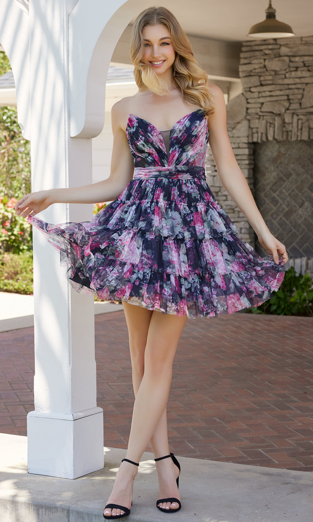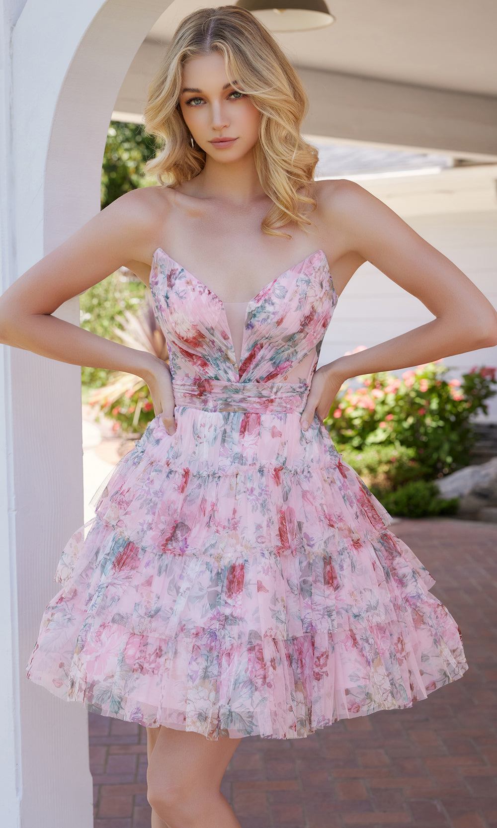 Details: | Strapless, Ruched Waistband, Layered Tiered Skirt, Floral Print, Mid-Open Back, Hidden Back Zipper |