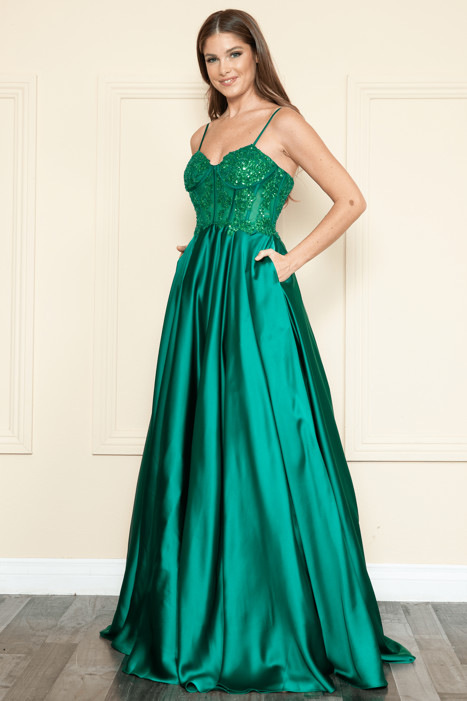 Wear this evening dress, Poly 9126, and be the belle of the night. Delicate spaghetti straps accentuate your shoulders and collarbone, framing the sweetheart neckline of this dress. A hint of detailed elegance is added by the embroidered details throughout the dress, and a sensual, feminine appearance is produced by the sheer corset bodice. Along with a pleated skirt and a closed strapped back that adds sophistication, the dress also features a sweep train that finishes the look with a touch of drama and elegance. Look refined in Poly 9126. Model is wearing Lavender, Emerald, Royal, and Turquoise colors.