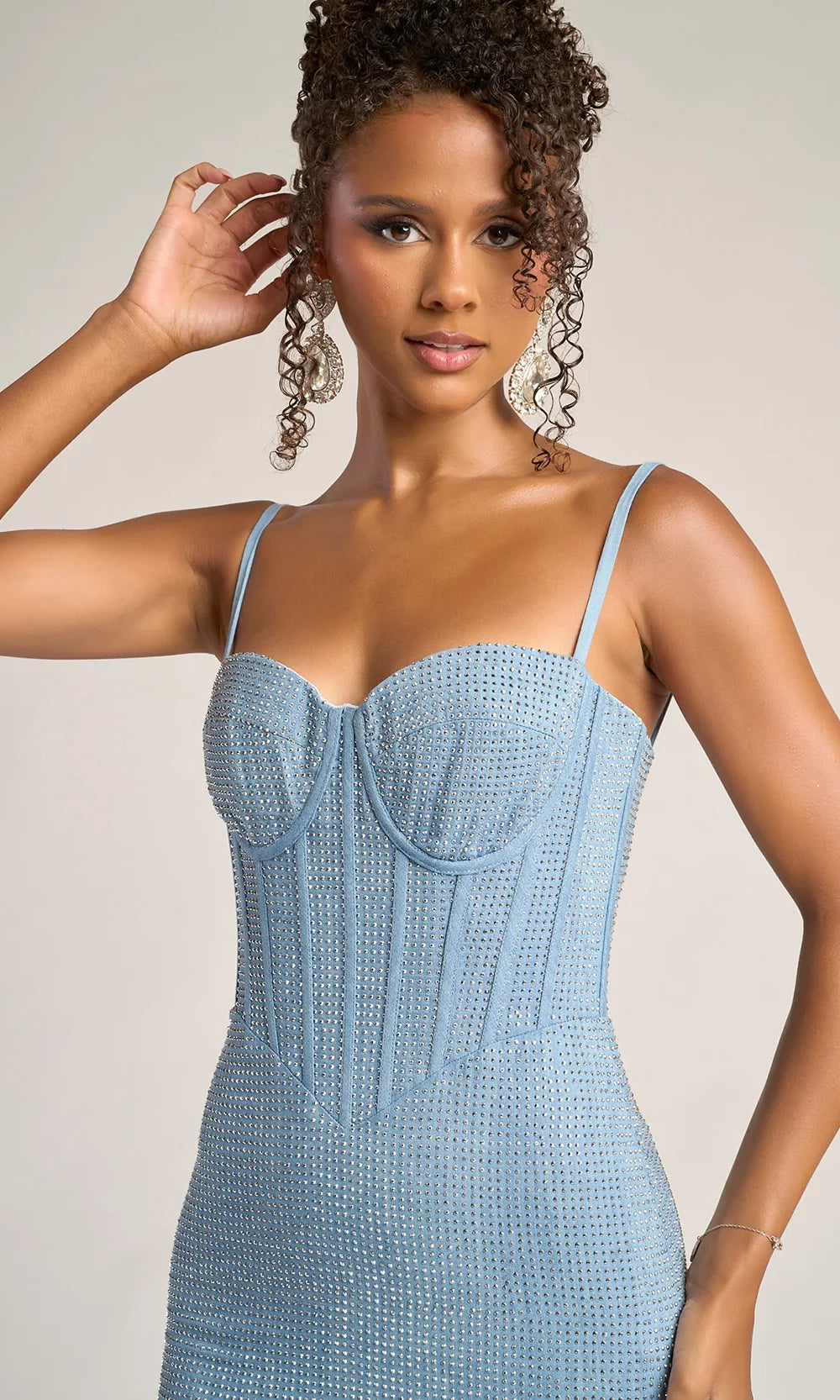 Sharp tailoring and dazzling texture combine beautifully in this standout gown from Portia and Scarlett PS26258. It showcases a defined sweetheart neckline with a corset-inspired bodice, structured boning and sleek spaghetti straps. The form-fitting silhouette is perfected by its flared mermaid hem and fluid sweep train that follows effortlessly. With its intricate beadwork and flawless design, this style captures attention from the first glance. For an unforgettable prom look, the Portia and Scarlett PS26258 delivers poise, precision, and glamour in perfect harmony. Model is wearing Denim Silver color.