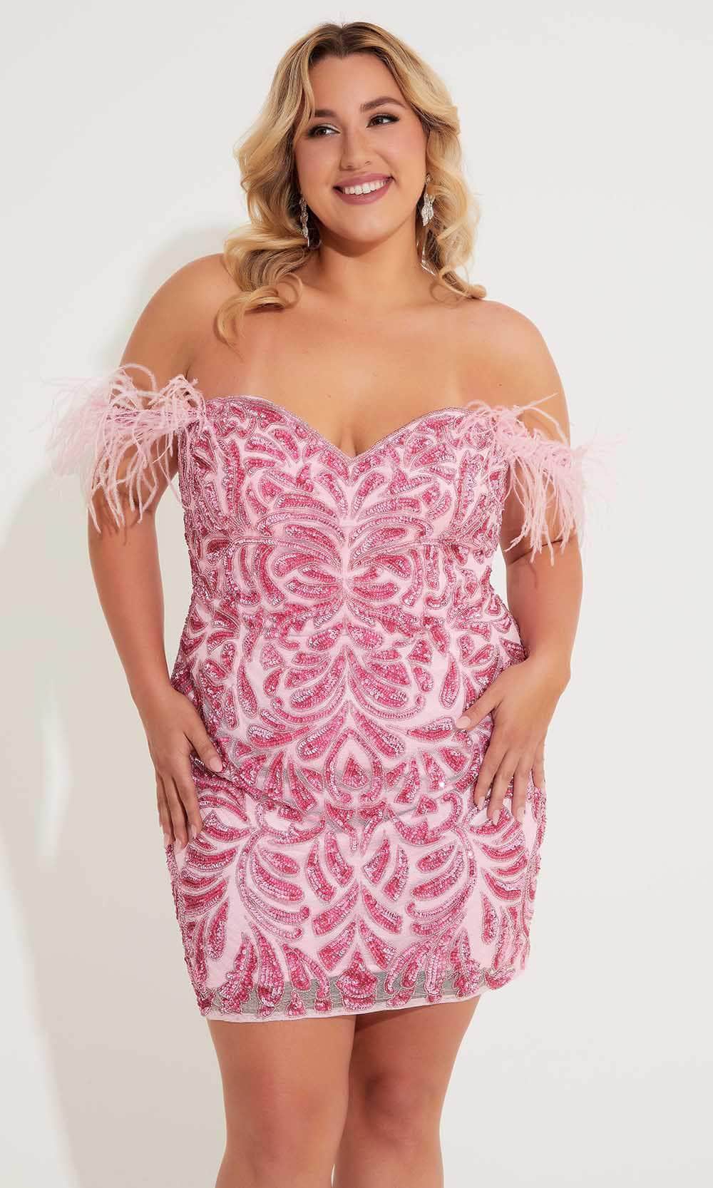 Be the epitome of feminine style in this magnificent Primavera Couture 14062, which is decorated with intricate sequin accents. It has an off-the-shoulder fitted bodice embellished with exquisite feathers and a sweetheart neckline that exudes refinement. The back features a lace-up tie and a central zip closure for a secure fit. A short-length skirt with a sophisticated sheath silhouette finishes the appearance. This Primavera Couture 14062 is ideal for any special occasion, seamlessly combining glamour and individual flair. Models are wearing Black, Burgundy, Candy Pink, and Midnight colors.
