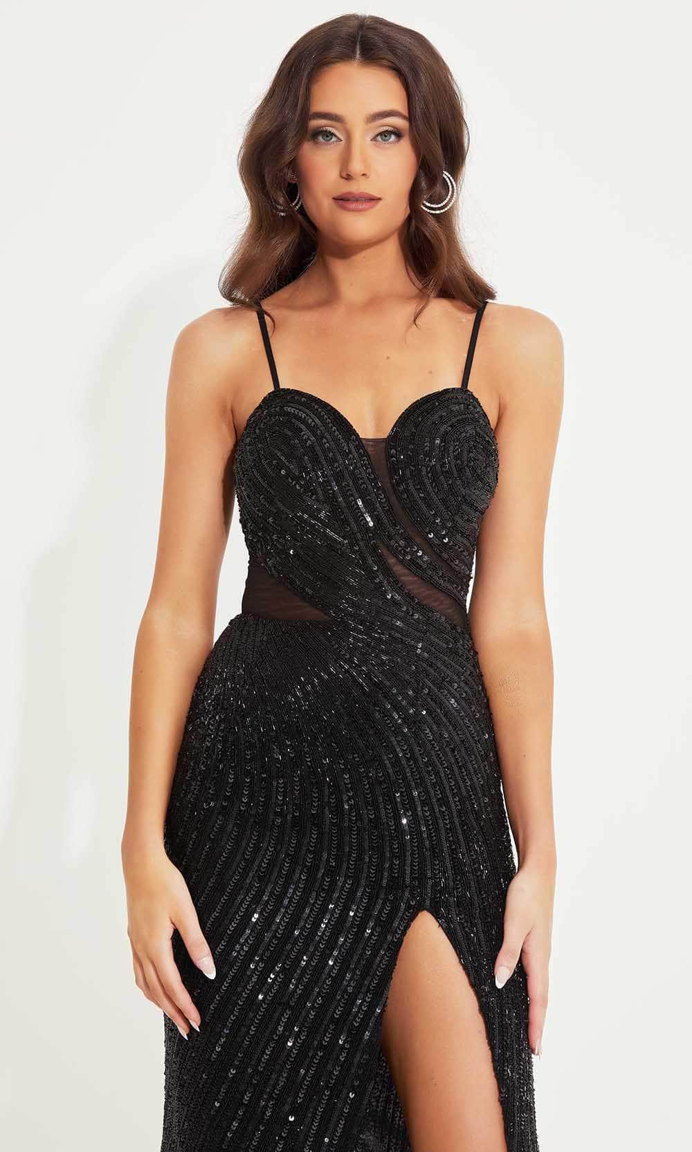 Transform your feminine style with the gorgeous Primavera Couture 4296, a brilliant masterpiece embellished with sequins. It has a sleeveless fitted bodice with a sweetheart neckline, a keyhole with a sheer insert, cut-out detailing, and adjustable spaghetti straps. The center zipper closure in the back ensures a secure fit. The floor-length skirt has a sleek sheath style, a slit, and an attractive train, making it ideal for any dazzling occasion. Because of its stunning style, Primavera Couture 4296 will capture attention at any formal event. Models are wearing Black and Nude colors.