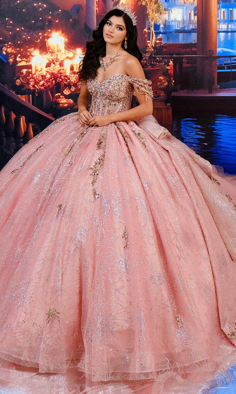 Radiate elegance in the Princesa by Ariana Vara PR30191, a Quinceanera gown that embodies timeless beauty. The sweetheart neckline and Basque bodice create a flattering silhouette, enhanced by shimmering cracked ice fabric with intricate metallic lace appliques, sequins and beaded embellishments. Off-the-shoulder straps provide a touch of romance, and the detachable ruffle train allows for a customizable look. With a matching capelet and convenient side pockets, this ball gown combines style and functionality, making it an ideal choice for your special day. Experience the magic of the PR30191. Models are wearing Slate/Gold, Rose Gold, and Magenta/Gold colors.