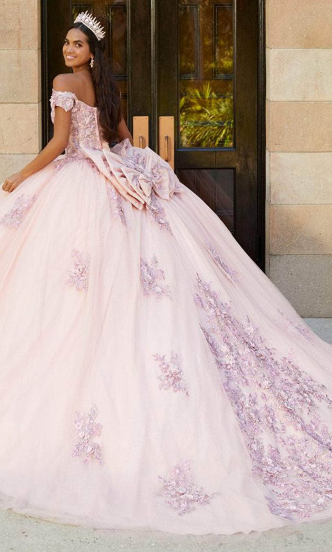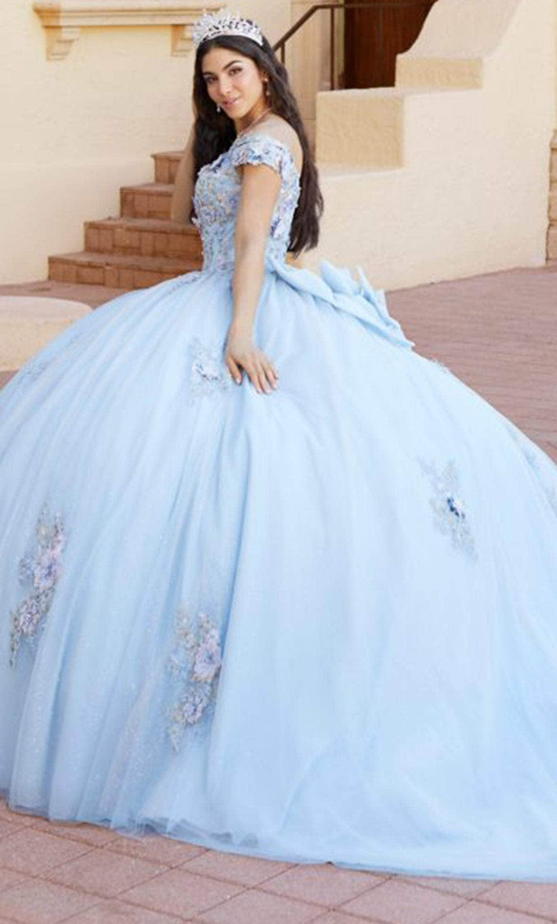 Quinceanera Collection 26061 will make you look like a true princess. With its beautiful embroidered lace appliqué corset bodice, that will sparkle under the party lights. It is embellished with three-dimensional embellishments and features a sweetheart off-the-shoulder neckline with two straps that may be worn on or off the shoulder. A highlighted embroidery design is featured at the back of the train, and the extra-large ballgown skirt displays embroidered motifs distributed throughout the skirt. The ensemble is finished with a sweeping train, a detachable quad row of lovely embroidered bows, and a lace-up back closure. Quinceanera Collection 26061 will provide you with the grace and elegance you need to enter your ball. Models are wearing Rose and Pink and Sky and Multi colors.