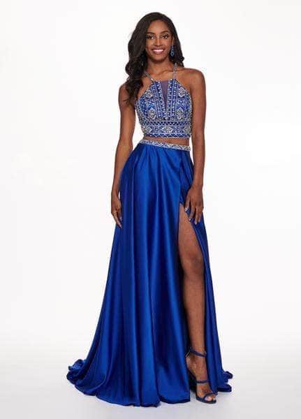 Look amazing in the alluring Rachel Allan 6497 masterpiece and steal the show on prom night. This gorgeous two-piece gown is made of opulent stretch satin and stands out thanks to its totally beaded bodice, halter-style neckline, and eye-catching beaded crisscross straps at the back. The deep slit and sweeping brush train on the wide A-line skirt are complemented by a beaded waistline and a beautifully draped front. Enter this magnificent masterpiece by Rachel Allan 6497 and leave a lasting impression.