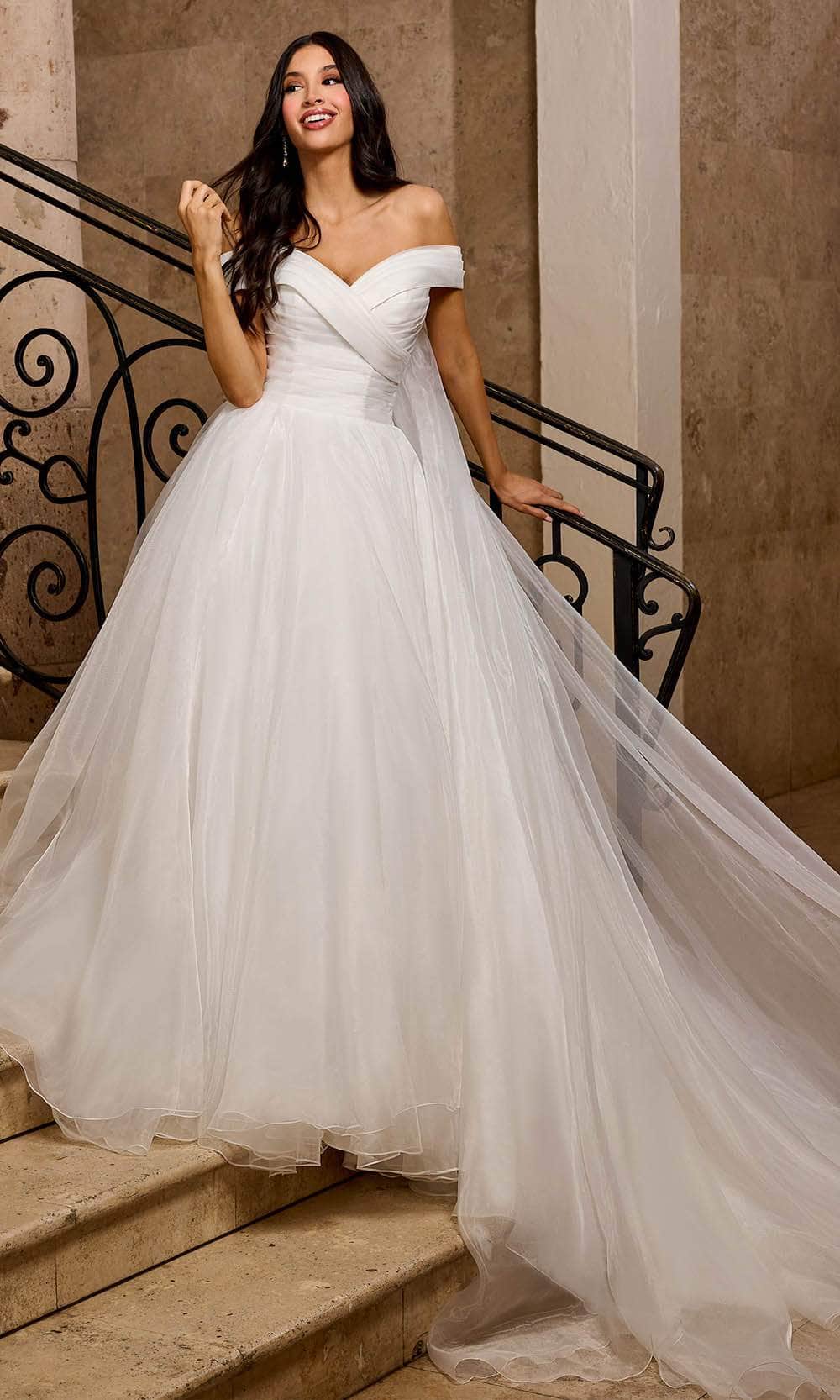 Immerse yourself in classic sophistication with the Rachel Allan RB5044, an enchanting A-line gown crafted from delicate tissue organza. The off-the-shoulder sleeves and sweetheart neckline radiate romance, complemented by a captivating lace-up tie at the back. The chapel train elegantly follows, evoking a grand ambiance. The highlight is the magnificent organza train that rises from the back, delivering a stunning and otherworldly conclusion. For brides in search of a flawless synthesis of elegance and romance, the Rachel Allan RB5044 stands as an ideal choice for their special day. Models are wearing Ivory, and White colors.