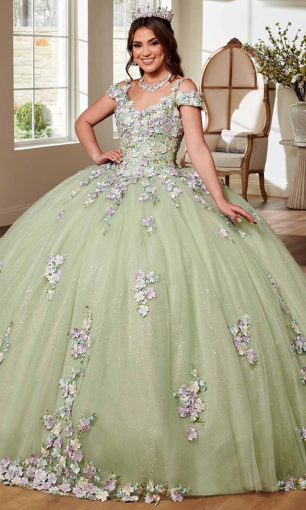This intricate design by Rachel Allan RQ1125 will make you bloom with beauty. The gown's multicolored 3D floral applique, glitter, and embroidery embellishments give it a remarkably stylish appearance. It has a low V-neck, thin straps, off-shoulder cap sleeves, and a cold shoulder style. For a customizable fit, the midrise back is accentuated with a corset lace-up tie. The sweeping train and billowing ballgown skirt that cascades to the floor finish off this beauty. Your inherent grace and beauty will be highlighted in this Rachel Allan RQ1125 gown. Models are wearing the Champagne Multi, and Sage Multi colors.
