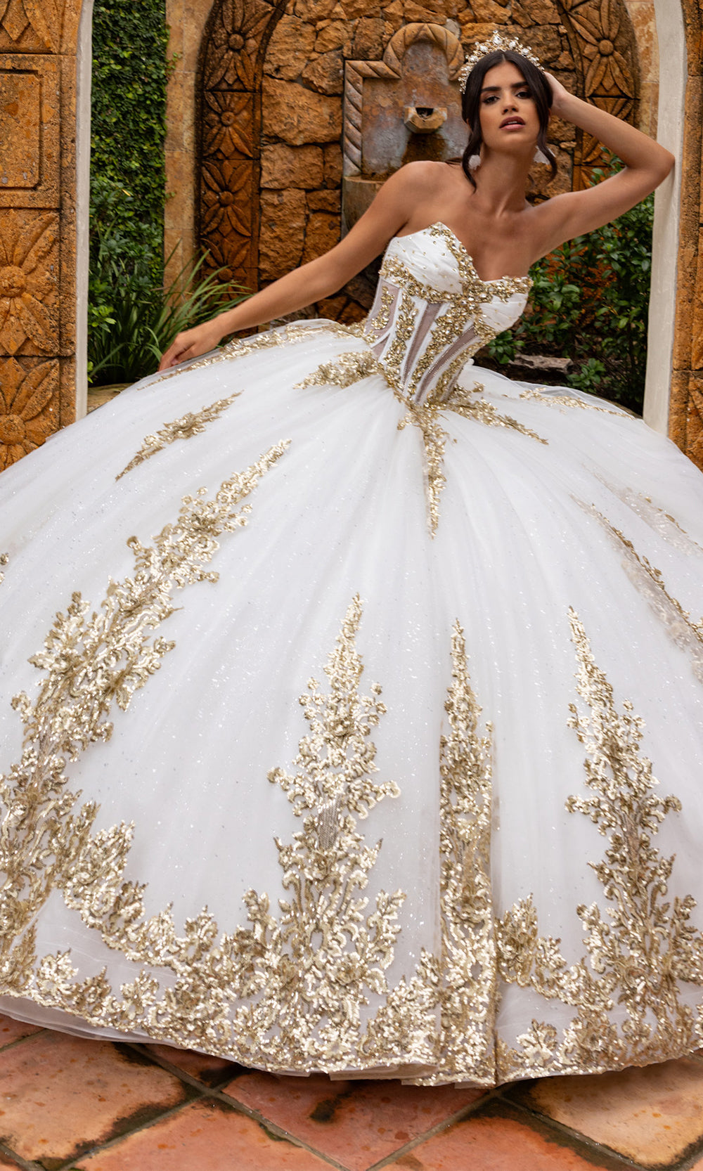 The artistry of Rachel Allan RQ2225 lies in its balance of detail and movement. Its bodice, shaped with a sweetheart neckline and sculpted with corsetry, is adorned with ornate 3D floral appliques, beaded and sequin embellishments. A multi-layered glitter ballgown skirt expands from a Basque waistline, giving dimension and texture to the silhouette. Rachel Allan RQ2225 is the gown of choice for any celebration requiring refined sophistication and feminine charm. Models are wearing Blush Gold, Ivory Gold, and Lilac colors.