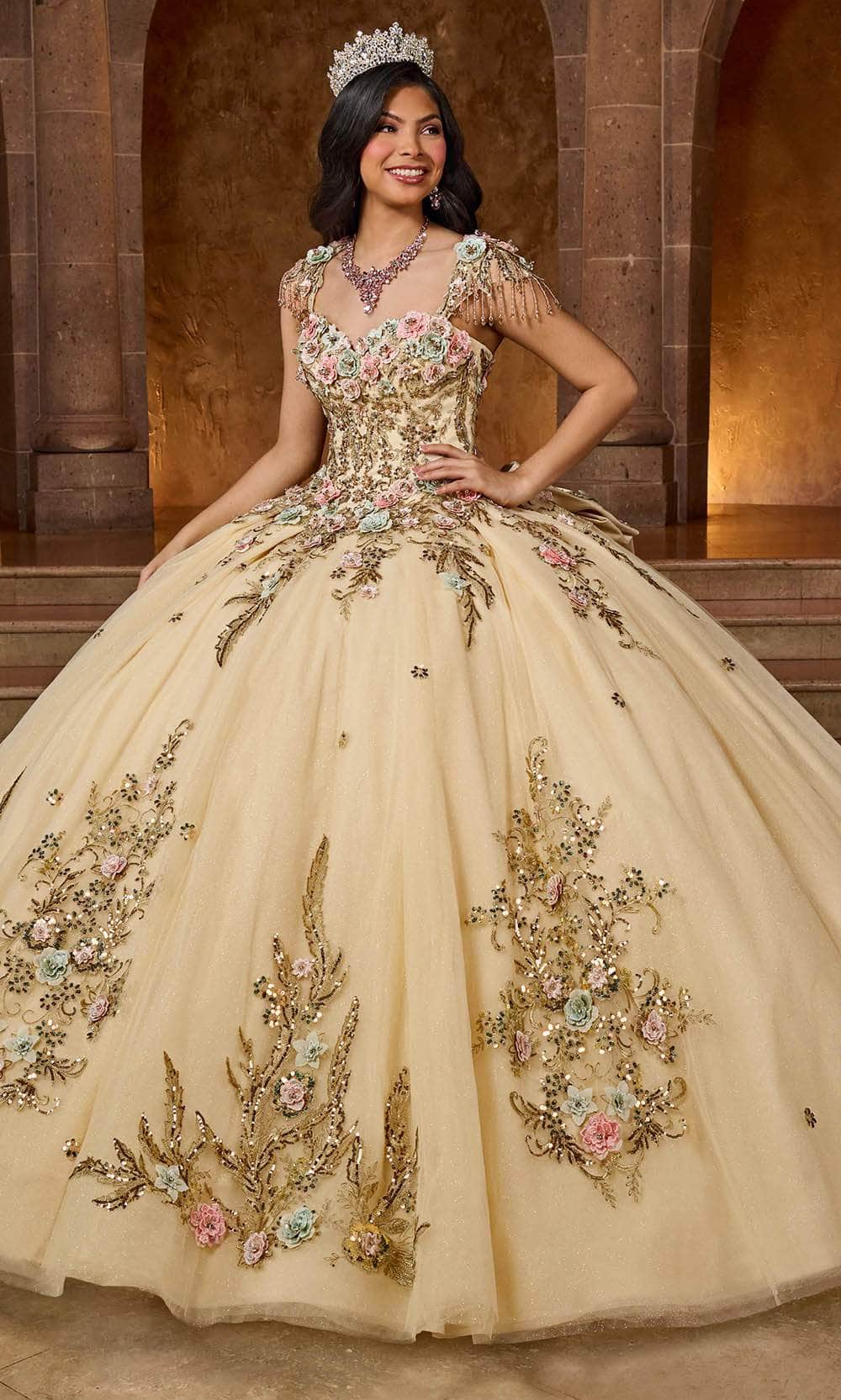 Showcase your elegance and strike a pose in the spotlight with Rachel Allan RQ3126, a stunning tulle ballgown crafted to capture hearts. The glitter tulle fabric elegantly shimmers and sparkles, reflecting light with each graceful movement. Adorned with intricate applique and beading, this gown emanates timeless elegance and sophistication, ensuring all eyes are drawn to you from the moment you make your entrance. The true highlight is the bodice embellished with breathtaking 3D flowers, complemented by a fringe shoulder detail that adds a touch of whimsy and individuality. Experience the remarkable impact in Rachel Allan RQ3126. Models are wearing Champagne Gold Multi and Light Blue Silver colors.
