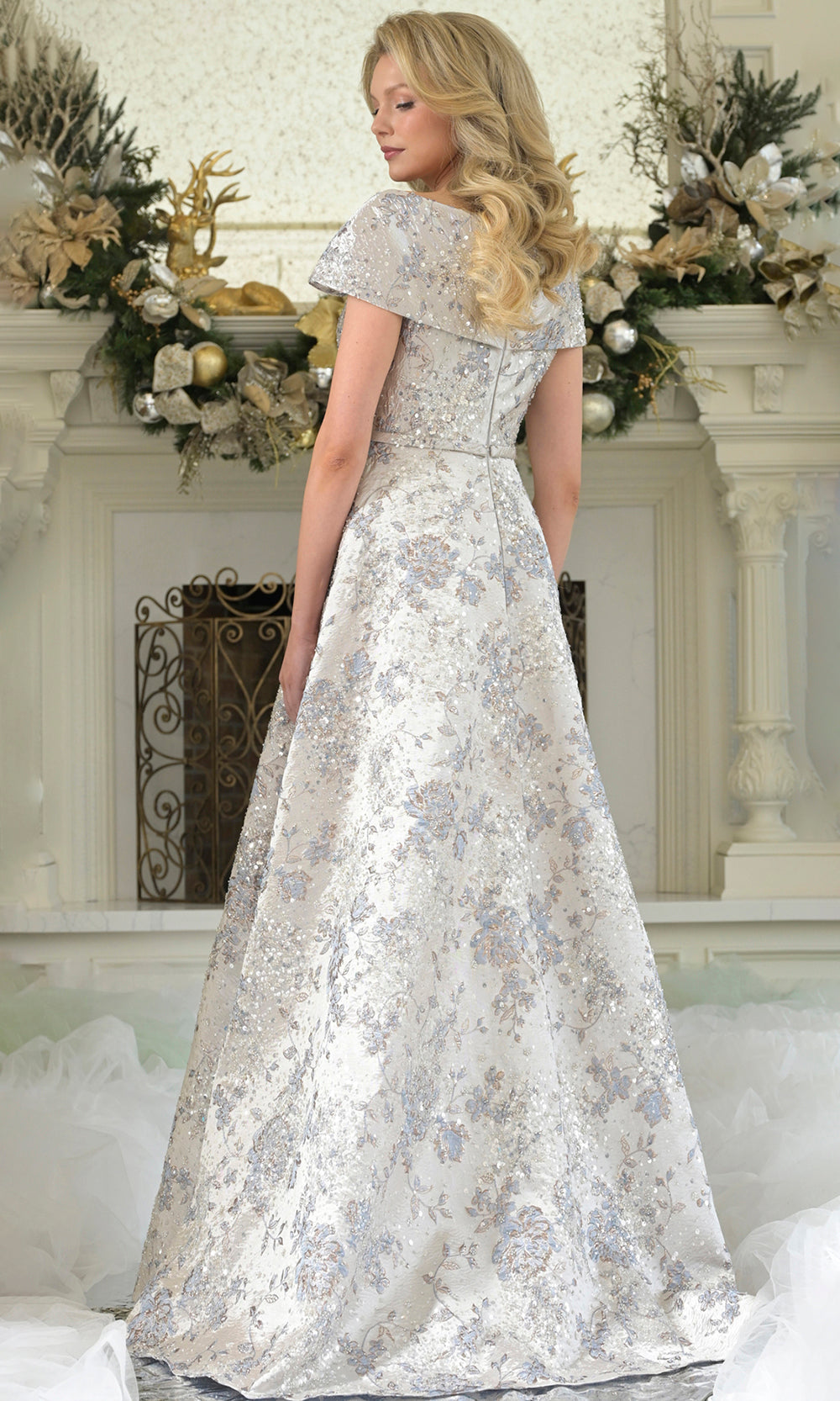 The Rina di Montella RD3312-1 dress emphasizes beauty through structure and embellishment, offering a look that resonates with sophistication. Its off-shoulder sleeves and v-neckline frames the decolletage with elegance, while the beaded and floral jacquard fabric reflects light in every movement. A natural waistline complements the A-line silhouette, creating a balanced and flattering profile. Wearing this Rina di Montella Rina di Montella RD3312-1 design promises a radiant and memorable impression. Model is wearing Blue Multi color.