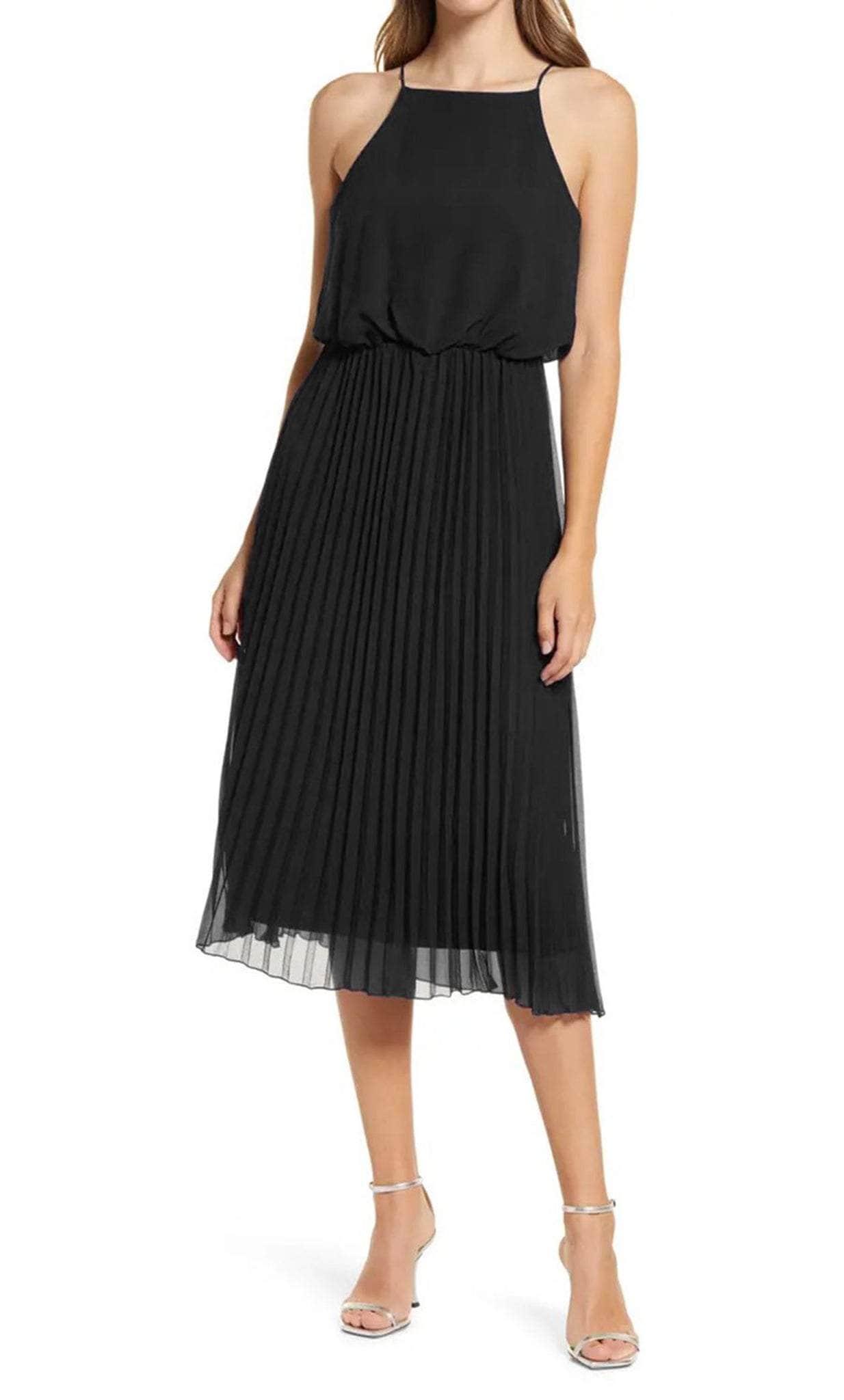 Take refuge in the fascinating elegance and beauty of this Sam Edelman 02S658 creation. Flatteringly enveloped with tailoring lines on a sleeveless bodice, this dress features a halter neckline with spaghetti straps. Detailed with a semi-racer styled back with a zipper closure, this blouson designed ensemble crafts an A-line silhouette with electric pleats and a tea length hemline. Claim that look of sophistication wearing this classy Sam Edelman masterpiece. Models are wearing the Black, Navy, and Leopard colors.