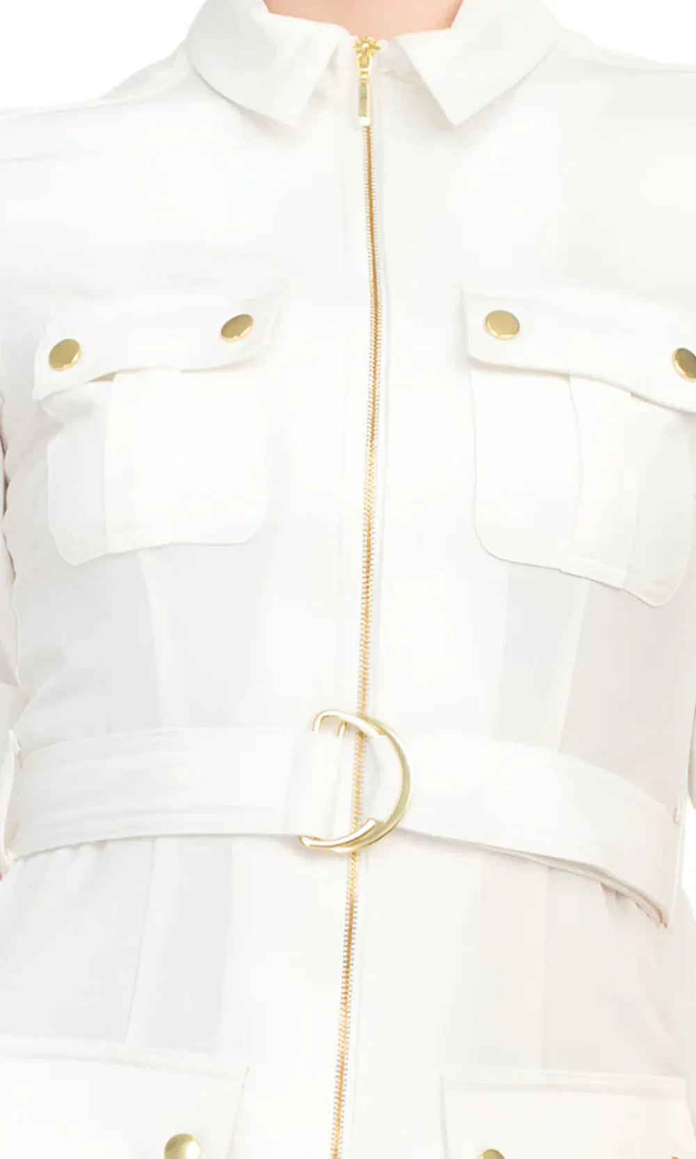 Details: Gold Zipper Front, Short Sleeves, Self-Tie Belt, Front Pockets, Closed Back
