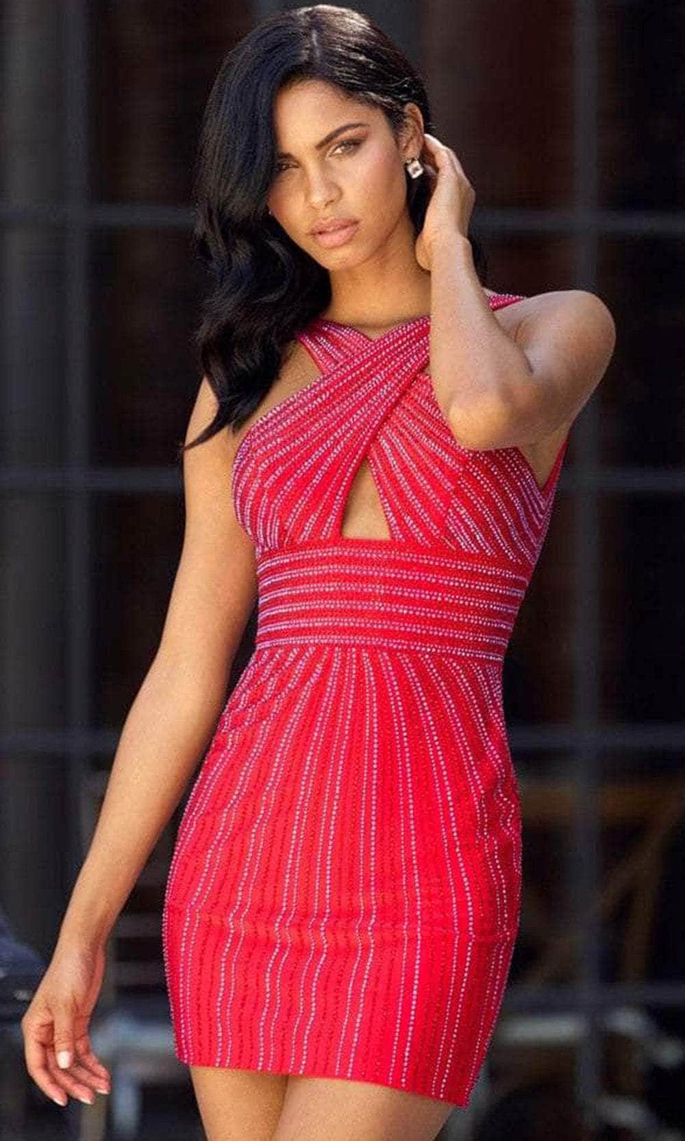 Put on this Sherri Hill 55194 to showcase your avant-garde style. This fitting sleeveless bodice is lavishly decorated with the hotfix, which oozes sophistication and style both inside and out. While you appear to grace the audience marvelously, this alluring gown has a halter neckline, an empire waistline, and a sheath skirt that fits down the hips. The back is mi-open and has a rear zipper closure. This Sherri Hill design is breathtaking! The model is dressed in crimson.