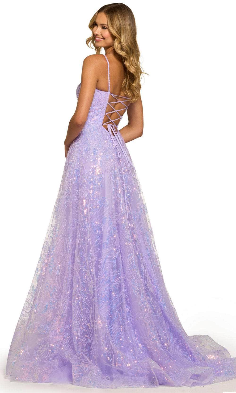 Sequins take on a whole new meaning on this long and elegant prom dress by Sherri Hill 55533. This gorgeous item makes an impression with its thin spaghetti straps, tight bodice, and scoop neckline. The bodice is detailed with exquisite embroidery that ends at the natural waist and stretches out into a majestic A-line style. A stunning holographic translucent overlay with embroidered details gives the outfit an otherworldly allure. With lines of intricate sequin detailing, this fully beaded A-line dress by Sherri Hill 55533 is the perfect pageant crossover. Model is wearing Lilac color.