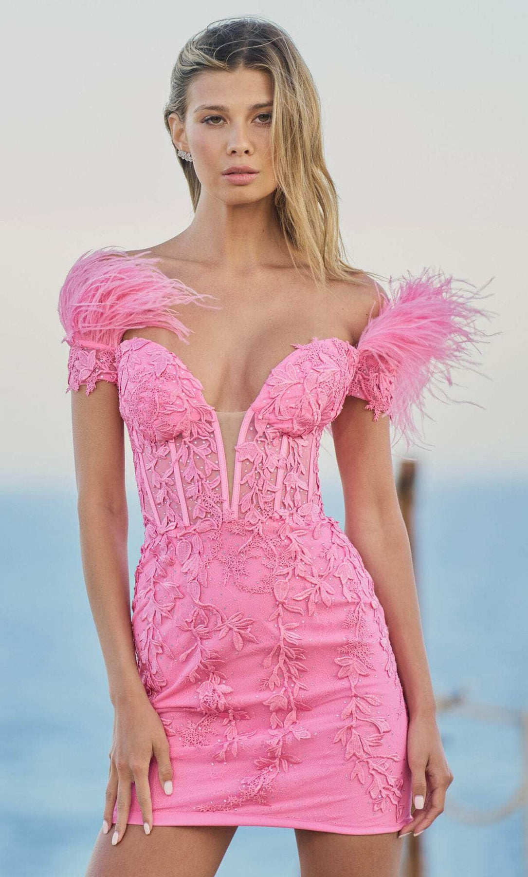 Glow a stellar look as you don this exquisite Sherri Hill 55778 creation. Ornate with scintillating accents and exuding leaf-embroidered details, this cocktail dress showcases an off-shoulder neckline encompassed by feathered motifs. An illusion-overlaid plunge pairs with a sheer bodice and corset boning. Offering ornamental lace details for the fitted skirt, as it cascades into a mini hemline. Turn heads and stand out from the crowd in this elegant Sherri Hill 55778 masterpiece - you'll be sure to dazzle and impress with your sophisticated look! Models are wearing the Black and Bright Pink colors.