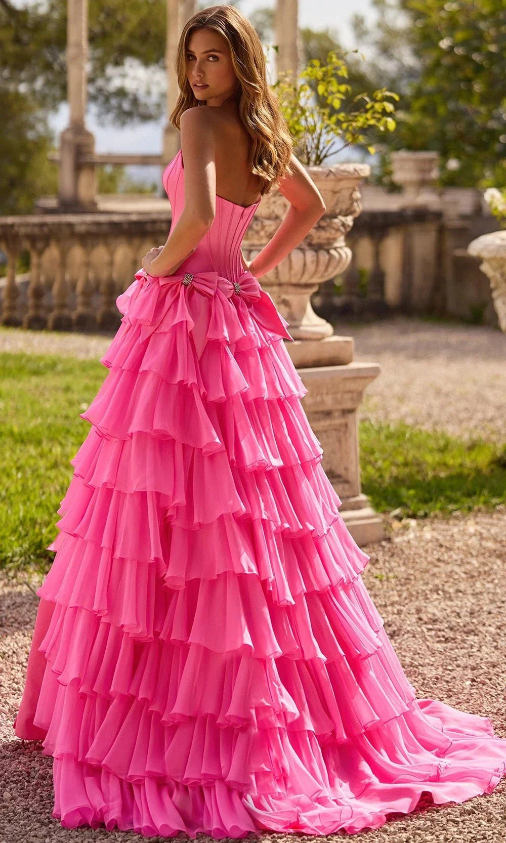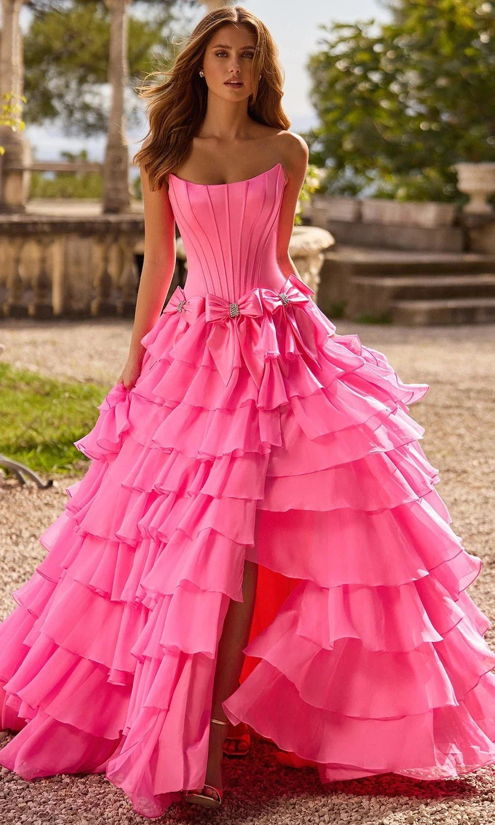 Introducing the Sherri Hill 57225, a captivating gown that redefines modern elegance with a touch of whimsy. The structured, strapless corset bodice sculpts the torso, accentuating the waist before flaring into a voluminous tiered ruffle ballgown skirt. Adorned with charming bow accents and a thigh-high slit, this gown balances playfulness with sophistication. Crafted from luxurious satin and chiffon, the Sherri Hill 57225 is designed to make a statement at any formal gathering, from galas to high-profile events. Model is wearing Candy Pink color.