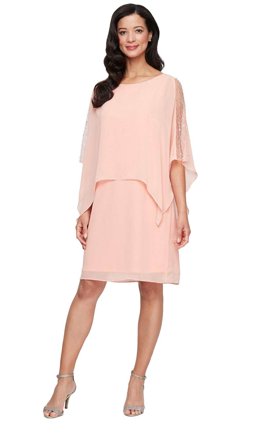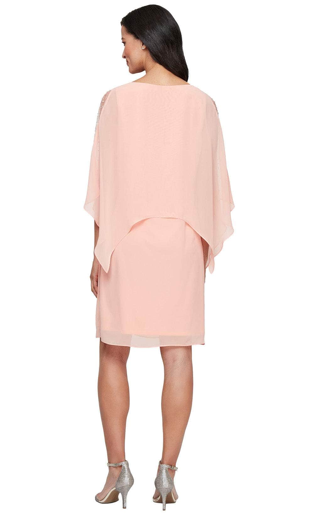 Make a bold statement with your beauty and poise in this S.L. Fashions 9270746 creation. This charming short dress highlights the beaded sheer capelet sleeves that offer a delicate sparkle. The chiffon poncho overlay styled with an asymmetrical hem, flows effortlessly for a soft, feminine touch. Featuring a bateau neckline and natural waist, this design ensures a graceful silhouette suited to various special occasions. You are sure to turn heads in this S.L. Fashions 9270746 masterpiece. Model is wearing Peach color.