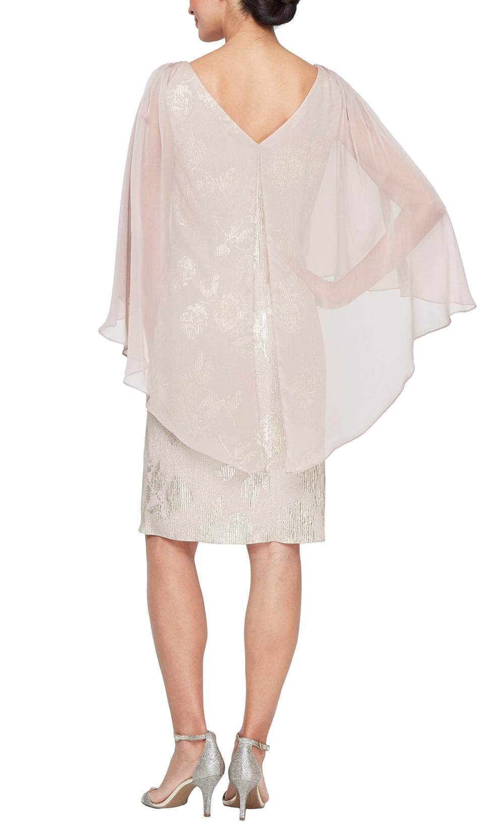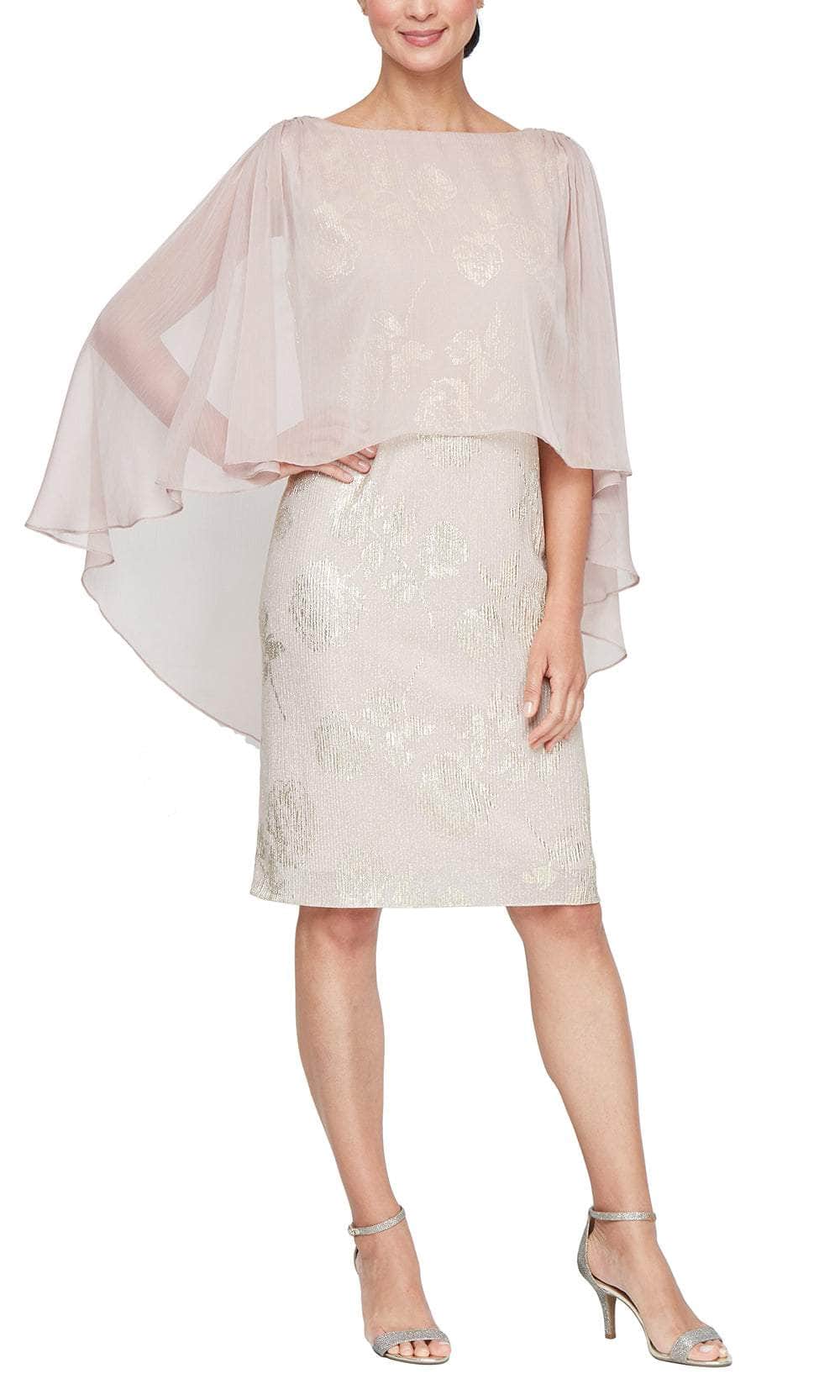 Capture the endless charm as you walk on this S.L. Fashions 9479479 masterpiece. This dress commands attention with its metallic capelet, gracefully falling into a high-low hemline. Elegant features are the bateau neckline paired with a full back design and gathered detailing in the shoulders. The fitted bodice floral prints accentuate your feminine charm. Lastly, the sheath skirt fits closely to your body and finishes at the knee-length hem to show off your sexy legs. Put your best foot forward in a S.L. Fashions 9479479 creation. Model is wearing Pale Blush color.