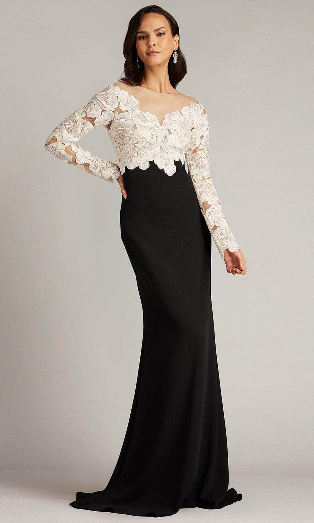 The Tadashi Shoji BOS24879L gown is a sartorial masterpiece, showcasing impeccable tailoring and design. The fabric drapes effortlessly, sculpting the feminine form, while the sophisticated mesh illusion neckline and fitted crepe skirt accentuate the silhouette. The long-sleeved bodice is adorned with intricate tidal flower embroidery, creating a captivating pattern, and the color block detailing adds a modern touch. The mermaid skirt with sweep train completes this elegant and refined ensemble, making it ideal for formal occasions. The Tadashi Shoji BOS24879L gown will leave you feeling confident and empowered. Model is wearing the Ivory/Black color.