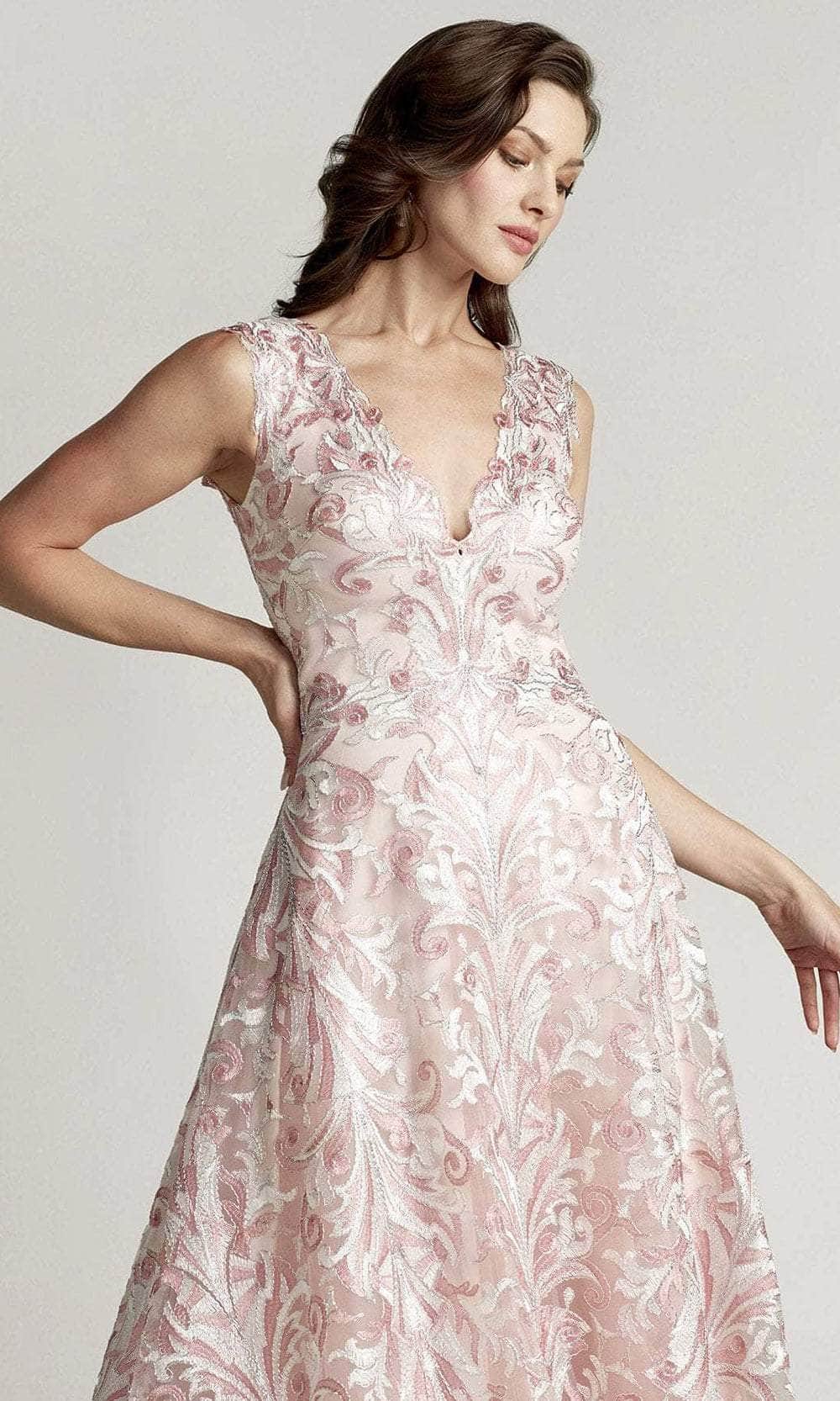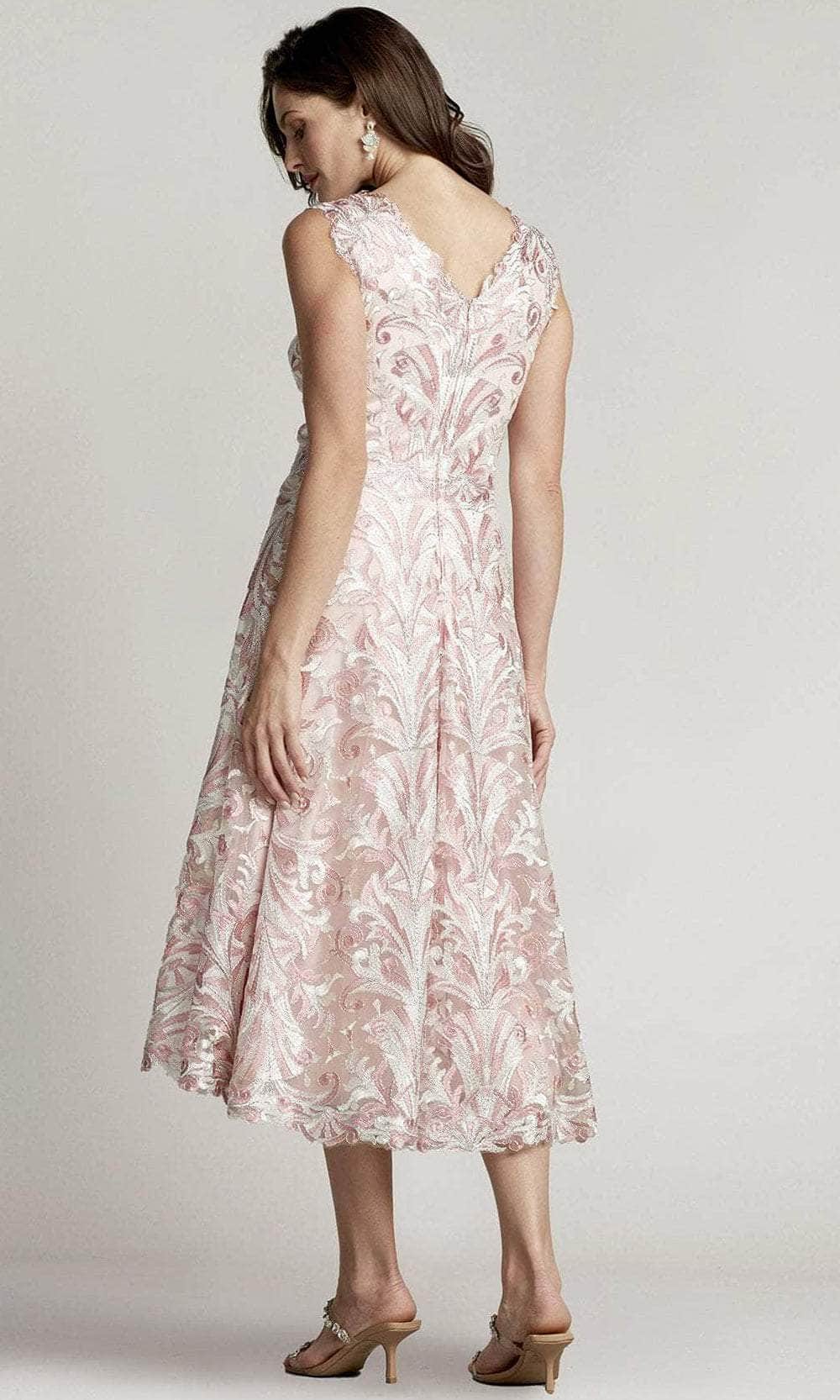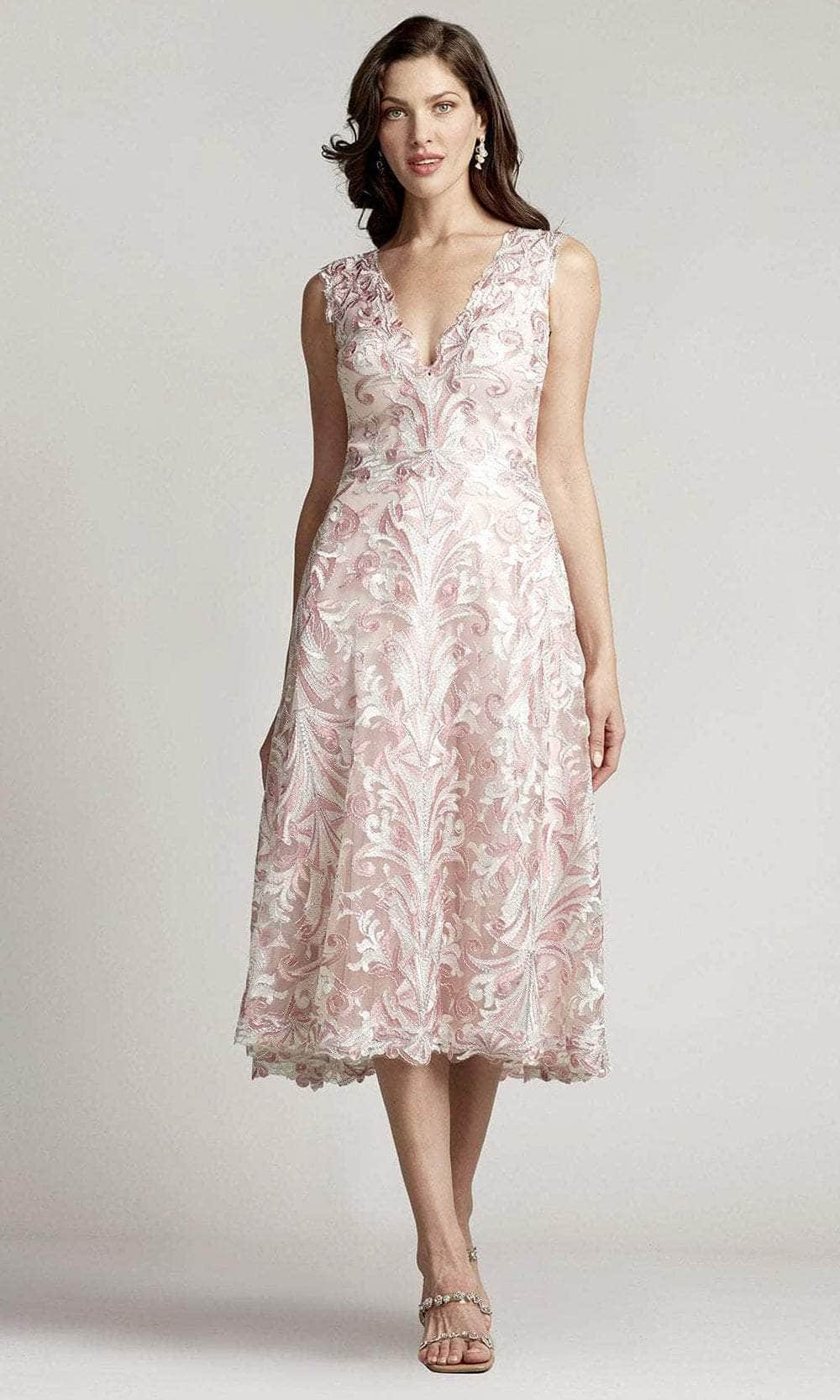 Look sophisticated and classy with this Tadashi Shoji BUE22195MD party dress. Impeccable embroideries festooned this stylish stunner. It is tailored in a sleeveless fitted bodice and styled with a deep V-neckline with scallop trimmings and supported by wide shoulder straps. It has a V-shaped mid-open back with zipper closure as the A-line skirt flares beautifully in a tea-length hemline. Show off your bubbly and pleasant personality with this Tadashi Shoji masterpiece. Model is wearing the Pale Pink/White color.