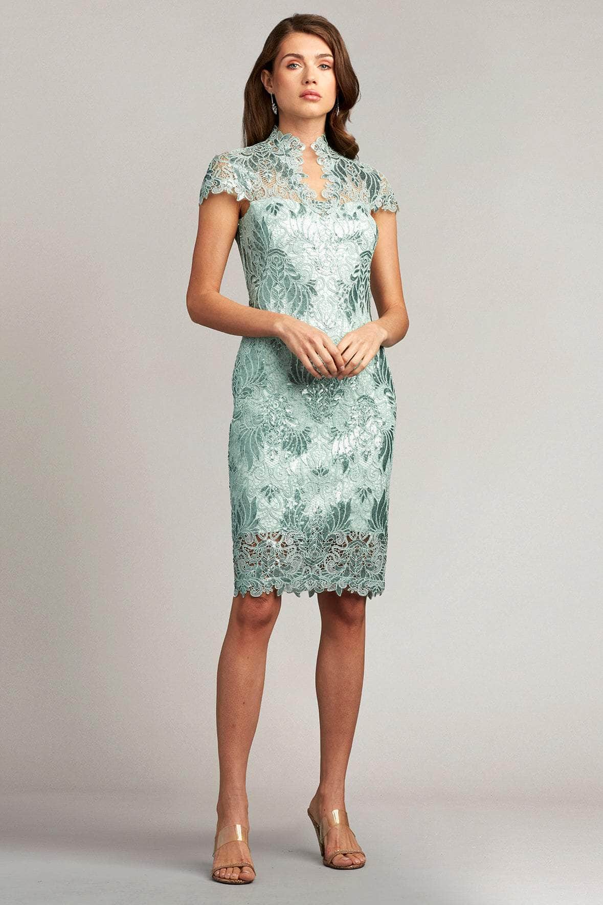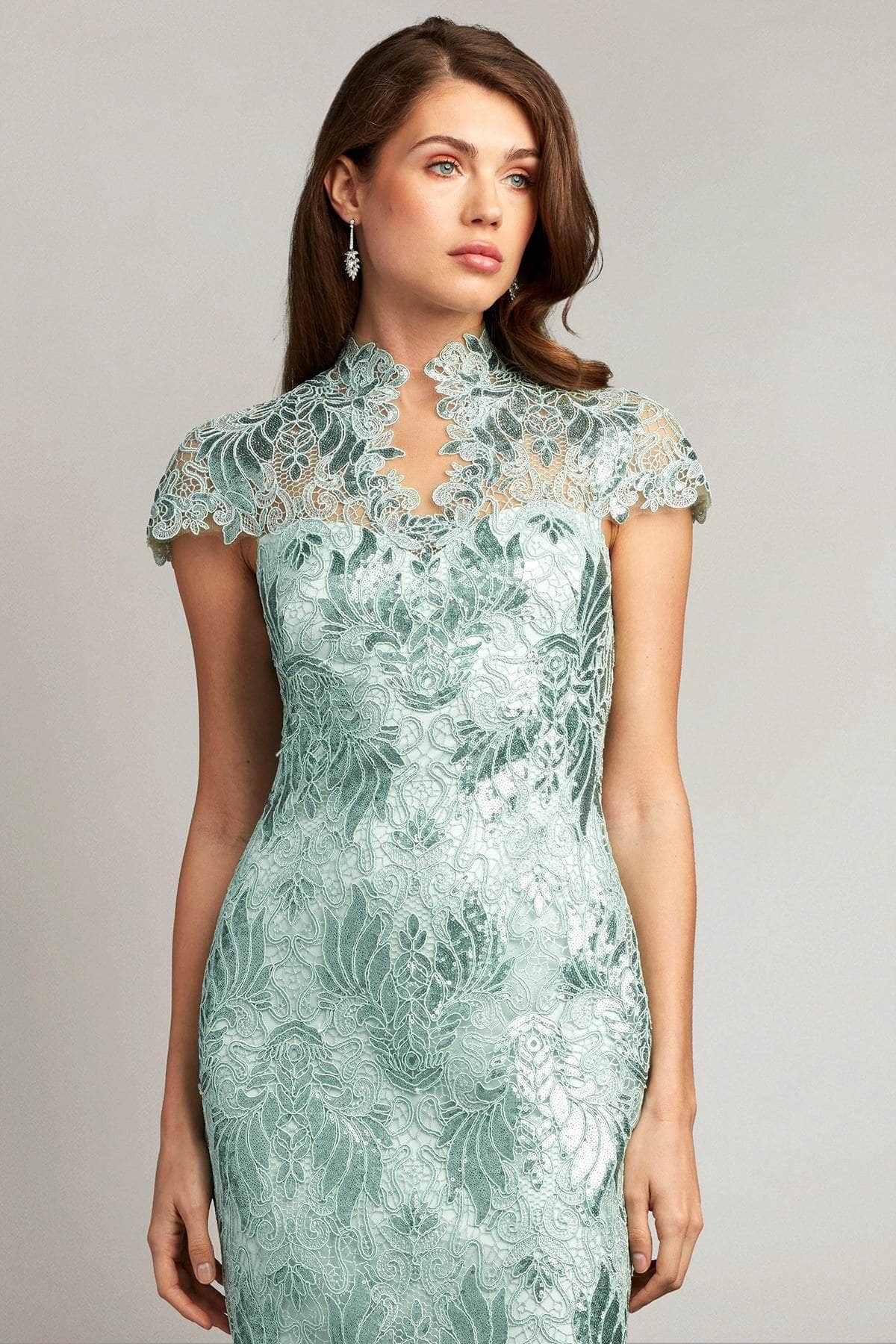 Turn yourself into a head-turning sensation by slipping into this utterly fetching dress from Tadashi Shoji CBD23064M. The Chinese collar is the dress' standout element, and paillette sequins in geometric intricacy adorn the whole bodice. Has a sheath silhouette that accentuates your shape and a scalloped hem. This outfit is ideal for casual to semi-formal occasions. Mesmerize the crowd with your sophisticated flair in this dress from Tadashi Shoji CBD23064M masterpiece. Model is wearing Frosted Jade color.