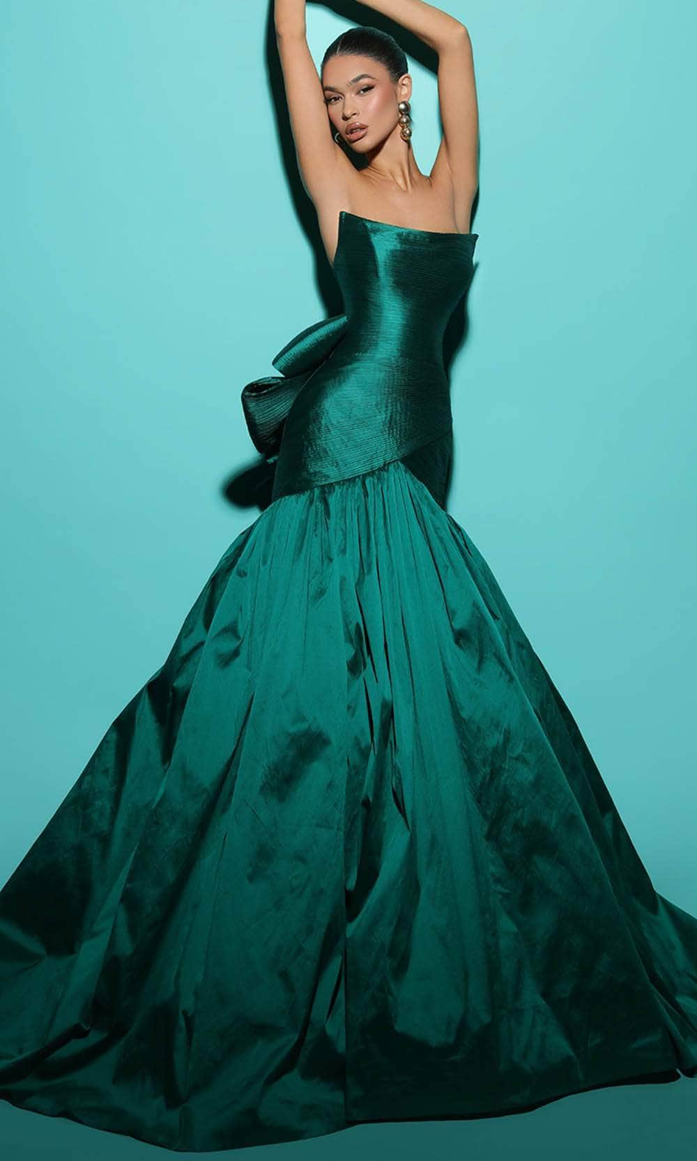 Set yourself apart from the fabulous crowd when you parade timeless elegance in this Tarik Ediz 98508 creation. Rendered with a strapless bodice and tailored with a wrap style bodice in a taffeta silhouette, this gorgeous piece features a strapless bodice with a scoop neckline. Crafted with a midrise back and a concealed zipper closure, an oversized bow accents the back as the skirt molds and flares into a trumpet design with a sumptuous spill of train. Make every moment last when you float into the ballroom in this inspired Tarik Ediz 98508 masterpiece. Models are wearing the Black, Red, Emerald, and Fuchsia colors.