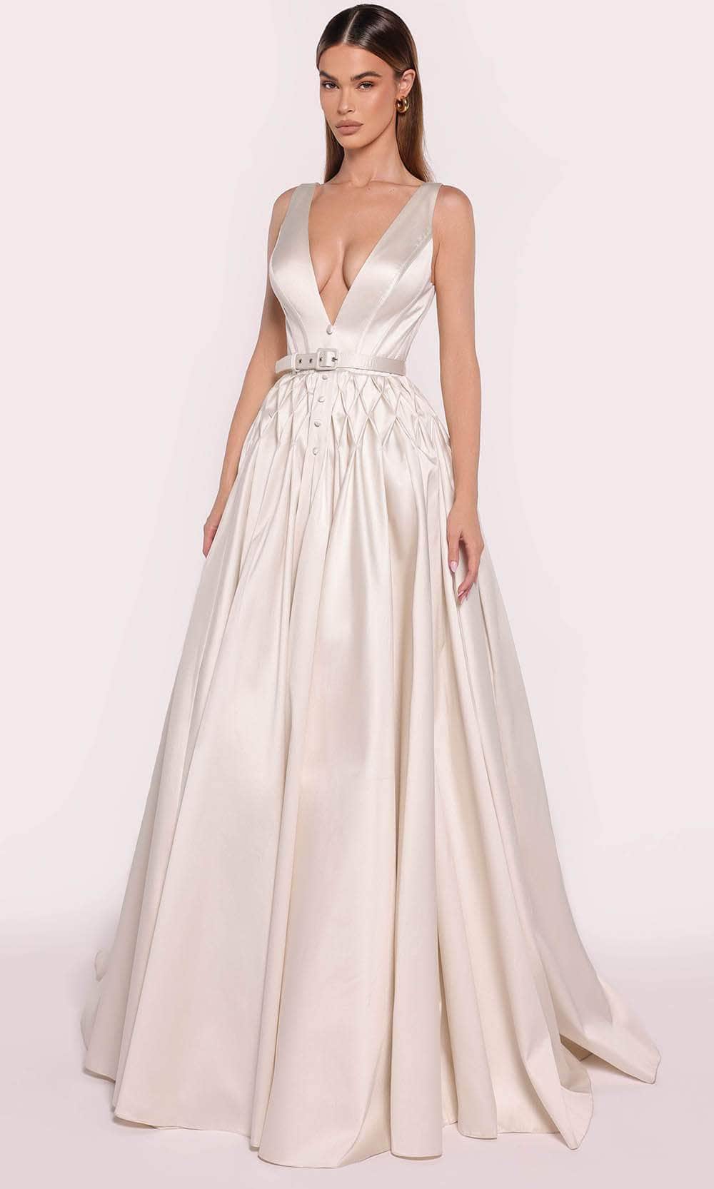 Discover the beauty and elegance of the Tarik Ediz 98732 dress. This stunning evening gown, made from luxurious taffeta fabric, showcases exceptional tailoring. Its structured design flatters your figure, while the sleeveless bodice and plunging V-neckline create a captivating look. The button-down accent and belt around the waist add a touch of sophistication. The A-line skirt with diamond-weaved accents and pleats flows gracefully into a sweeping train. The Tarik Ediz 98732 dress is the perfect choice for anyone looking for a gown that combines modern style and timeless elegance for any formal occasion. Model is wearing the Stone color.