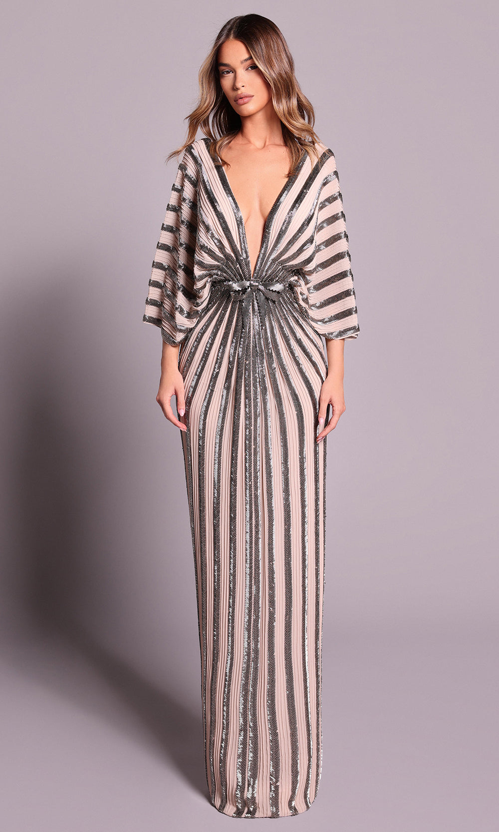 Effortless lines meet contemporary detailing in Tarik Ediz 99043, a beaded striped dress with a relaxed yet tailored presence. Its plunging V-neckline elongates the upper frame, while wide kimono sleeves create gentle volume and soft movement. The natural waist is accentuated by subtle gathering and a beaded bow, adding visual interest while preserving the dress column flow. Shimmering beadwork traces the vertical stripes, creating a refined texture that enhances the silhouette. The Tarik Ediz 99043 embodies refined allure, making it an exquisite selection for meaningful celebrations.