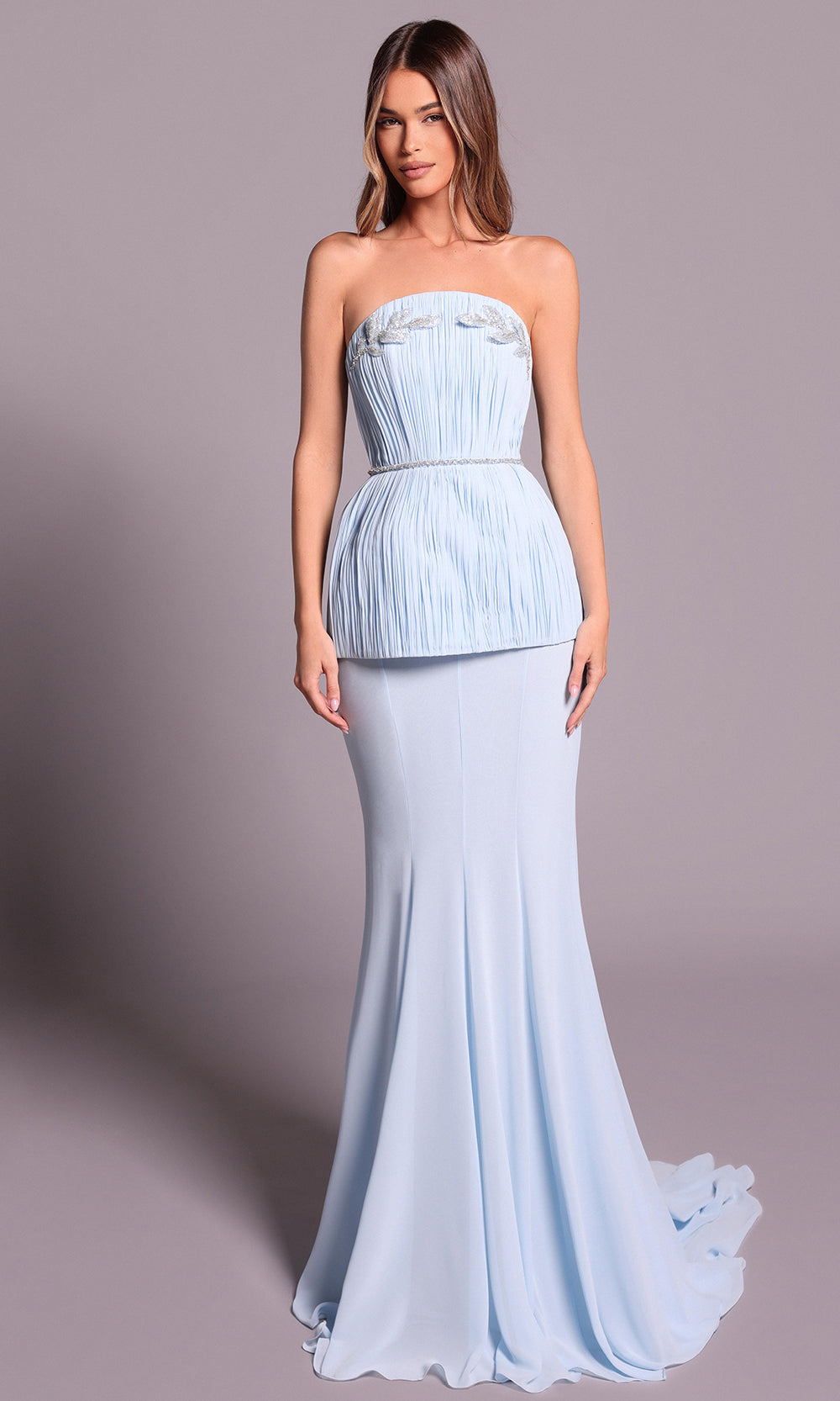 A seamless fusion of structure and softness defines the Tarik Ediz 99123. Its strapless straight-across neckline leads into a finely ruched bodice that highlights the natural waist with a soft peplum finish. The sheath skirt glides effortlessly to the floor and extends into a subtle sweep train, adding presence without overwhelming the look. Perfect for those seeking a blend of classic shape and contemporary style, the Tarik Ediz 99123 stands out with clean lines and thoughtfully placed detailing that feels both timeless and unique. Model is wearing Blue Aura color.