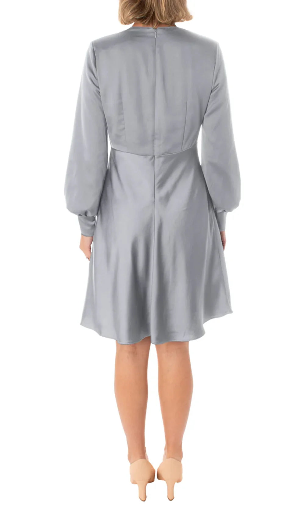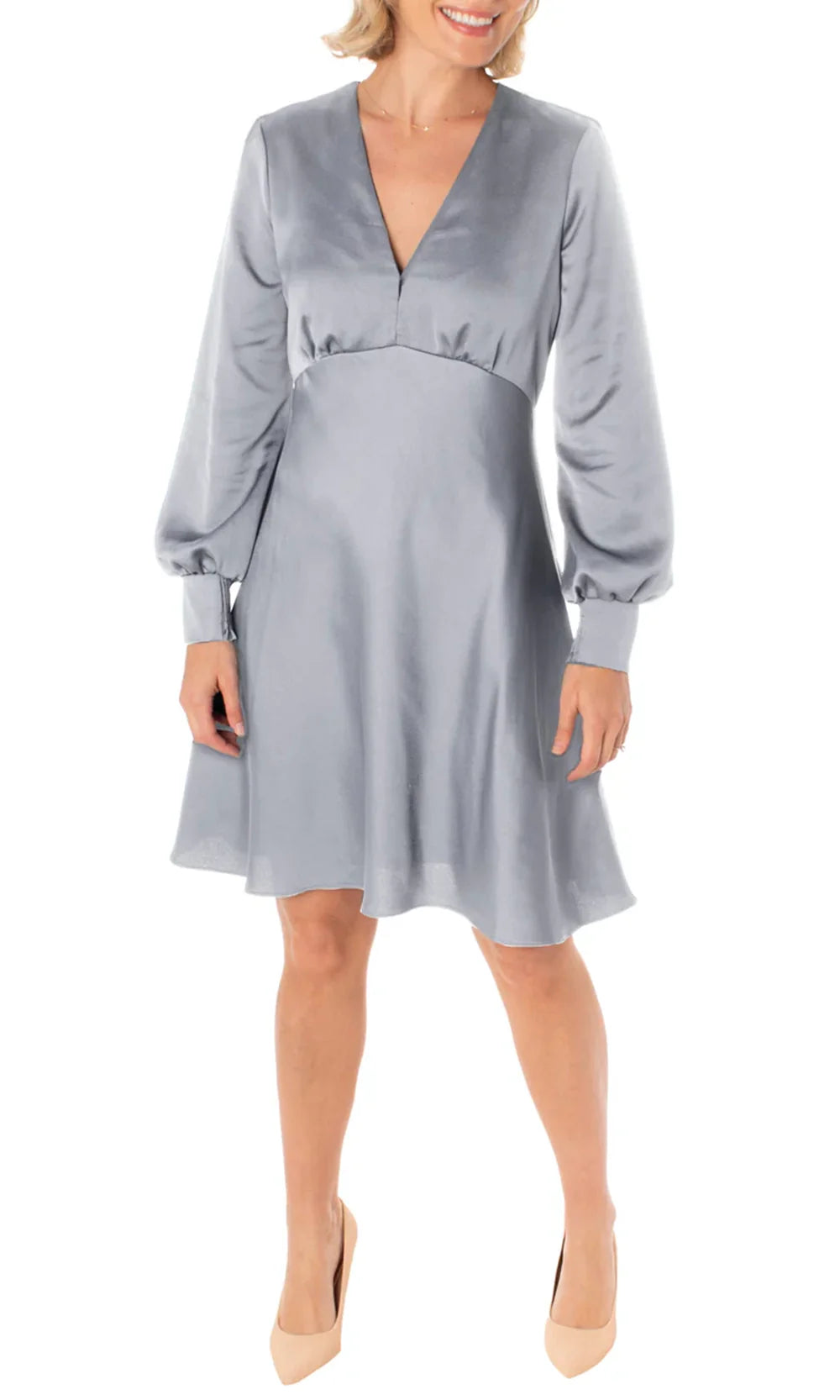 Grace and comfort combine in Taylor 3176M, an A-line satin dress tailored for timeless beauty. Featuring a flattering V-neckline and long sleeves with buttoned cuffs, this style offers both elegance and ease. The empire waistline ensures a smooth fit through the bodice before flaring into a flowing knee-length hem. Perfect for weddings, celebrations, or elevated daywear, this design delivers both poise and movement. Select Taylor 3176M to add a polished satin piece to your occasion-ready wardrobe. Model is wearing Smoke Grey color.