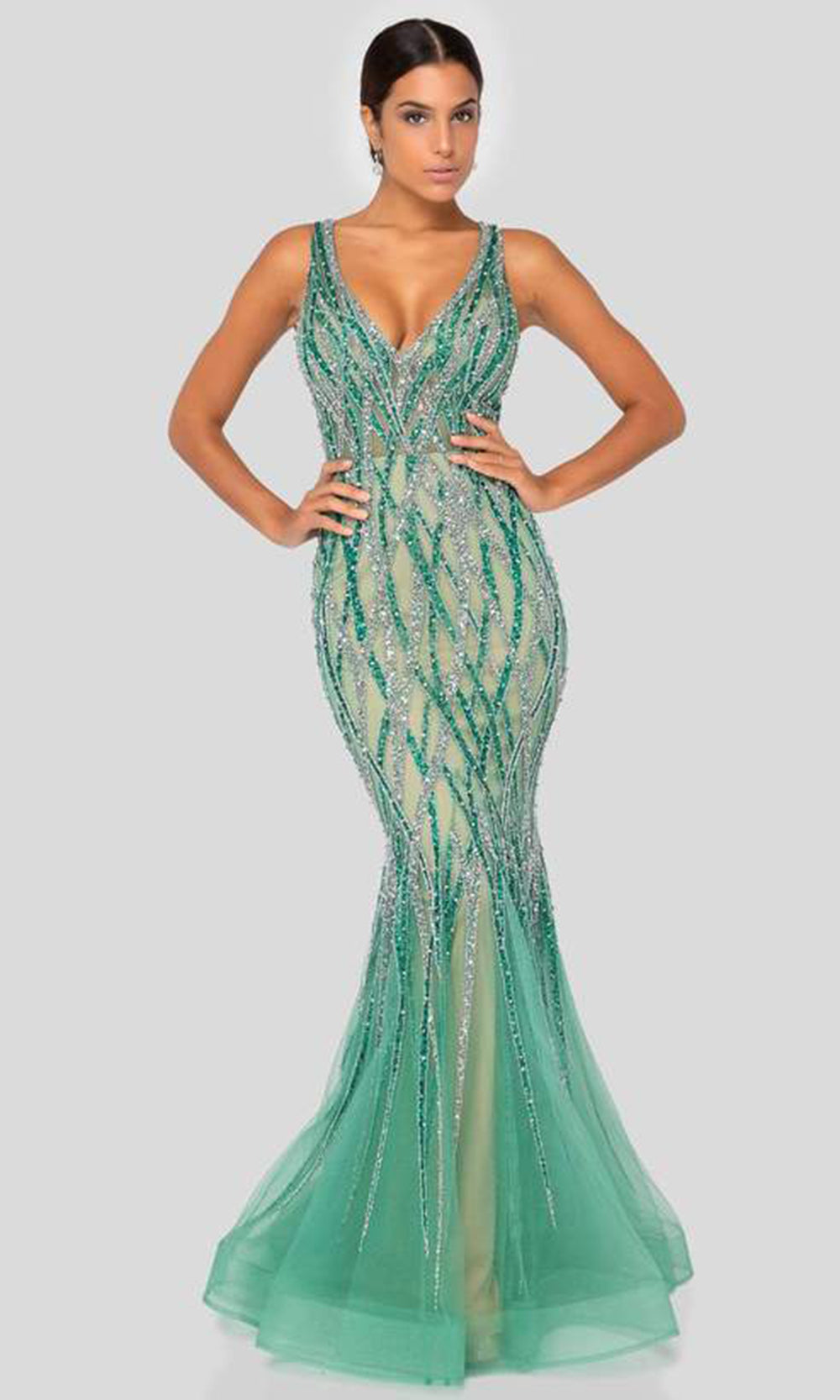 Walk the red carpet in style wearing this stunning Terani Couture 1912GL9573SC. This sophisticated ensemble is completely wrapped in sheer overlay, embellished with glittering weaved lines, over a nude underlay. Features a sleeveless fitted bodice, V neckline and full covered back with center zipper closure. The dress is sculpted in fit to flare silhouette with godets forming mermaid skirt and horsehair hem floor length finish. Flatter your shape with a sculpted gown from Terani Couture. Model is wearing the Jade Nude color.