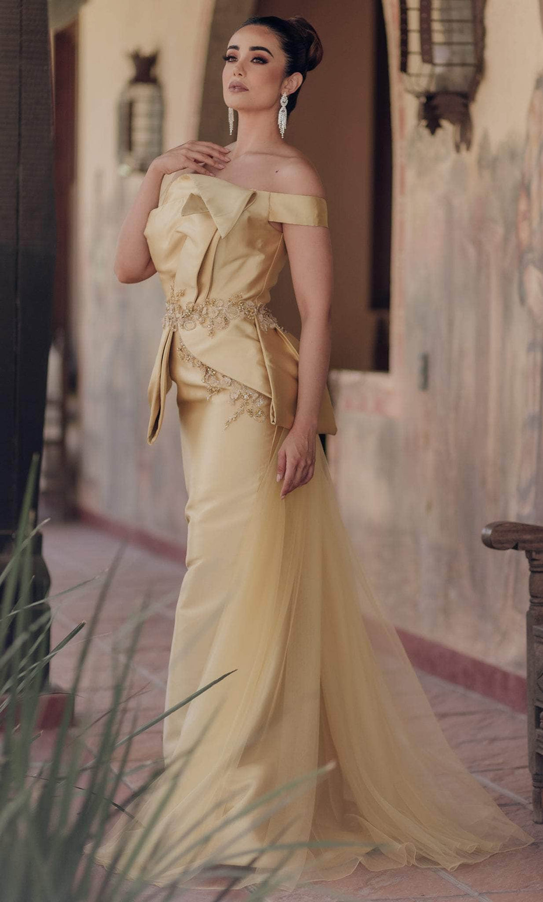 Bask in the spectacular beauty of this floor-length Terani Couture 232E1241 creation. Highlighted with a fold-accented bodice and beaded embroidery, this gown is sure to be attention-grabbing. It features an off-shoulder neckline, cap sleeves, and peplum. The skirt flawlessly flares into a mermaid silhouette, which is finished with a sweeping train and tulle overskirt for more drama. This Terani Couture 232E1241 evening gown will not let anyone miss your grand entrance. Model is wearing the Gold color.