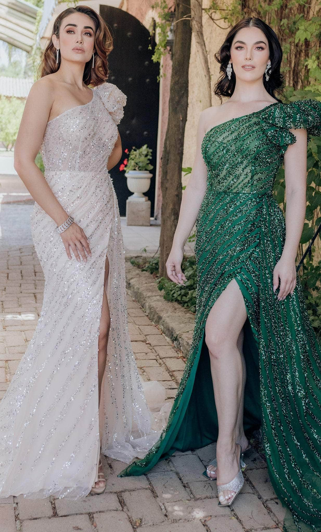 Dazzle and captivate in the spotlight with our Terani Couture 232GL1479. A One Shoulder Ruffled Sheer Bodice Beaded Long Dress that embraces the allure of its mesmerizing one-shoulder neckline, a symbol of modern sophistication. The sheer bodice delicately reveals hints of skin, adorned with ruffled one-sleeve that create a sense of ethereal movement. Exquisite sequins add a touch of opulence, catching the light with every step. The sheath silhouette gracefully flows, enhancing your elegance and grace. With a convenient zipper and hook and eye closure, this gown ensures a seamless fit. Embrace timeless beauty and make an unforgettable statement with this stunning Terani Couture 232GL1479 masterpiece. Models are wearing Cream and Hunter colors.