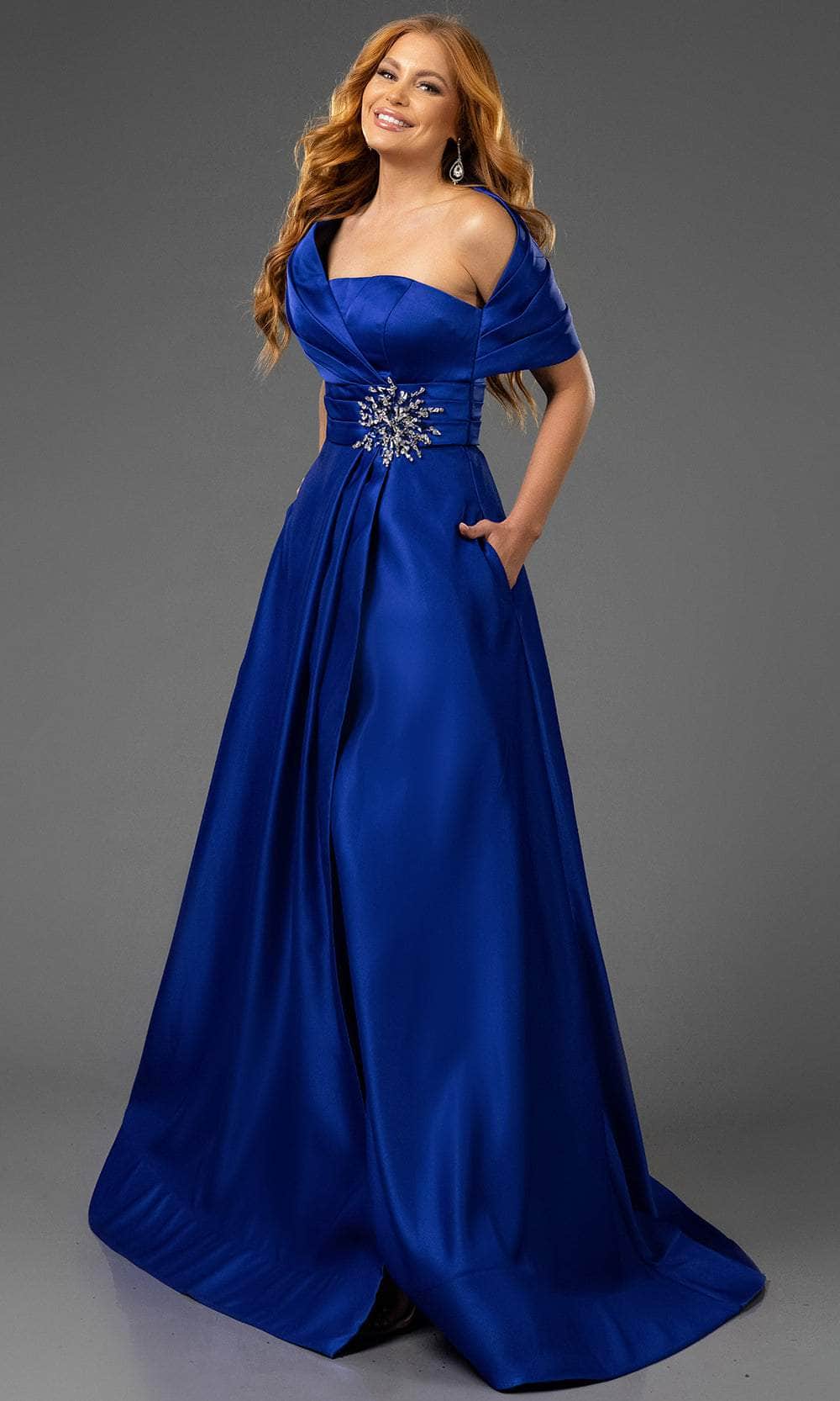 Make your next special occasion extraordinary with this Terani Couture 251M4441 creation. Elegance abounds in this satin gown, featuring pleated details on the wide waistband and short sleeves A beaded brooch at the waist adds sparkle, while the gracefully frames your face. The mid-open back and thigh-high slit offer an alluring hint of skin. The wrap skirt creates a soft A-line silhouette, gracefully finishing with a sweep train. This Terani Couture 251M4441 masterpiece is simply captivating. Models are wearing Rose, Royal, Gold, Navy, Red, Slate, Sage, and Black colors.