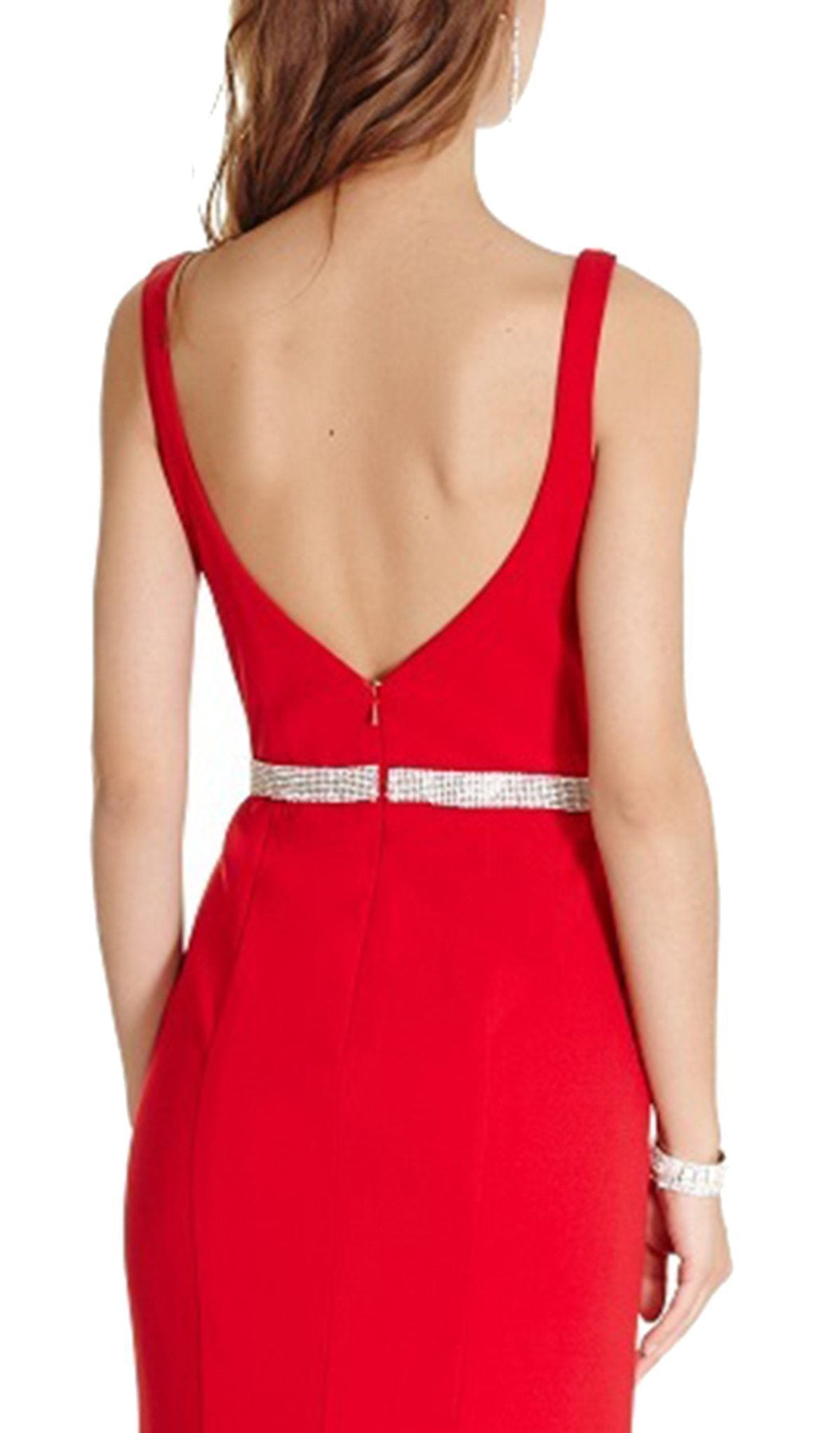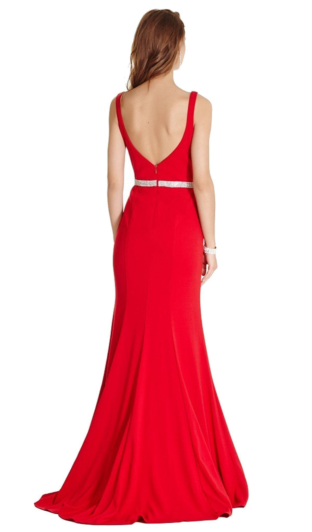 Brave the evening with temptress beauty and grace wearing this Trevi Collection L11795 creation. This alluring dress flaunts a sleeveless, plunging V-neckline with sheer panel at mid-bust. The back has a low V-cut and a zipper closure. Accentuating the waist is a glittering waistband. The skirt flourishes towards the floor in a fitted silhouette and finishes the look in a sweep train. Look like a star in this Trevi Collection masterpiece. Model is wearing the Red color.