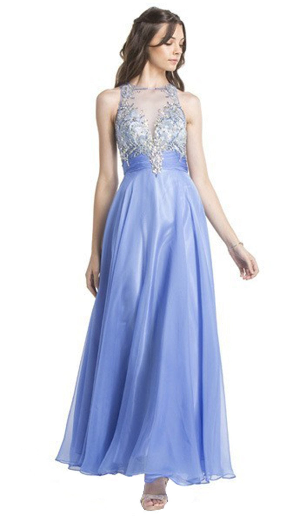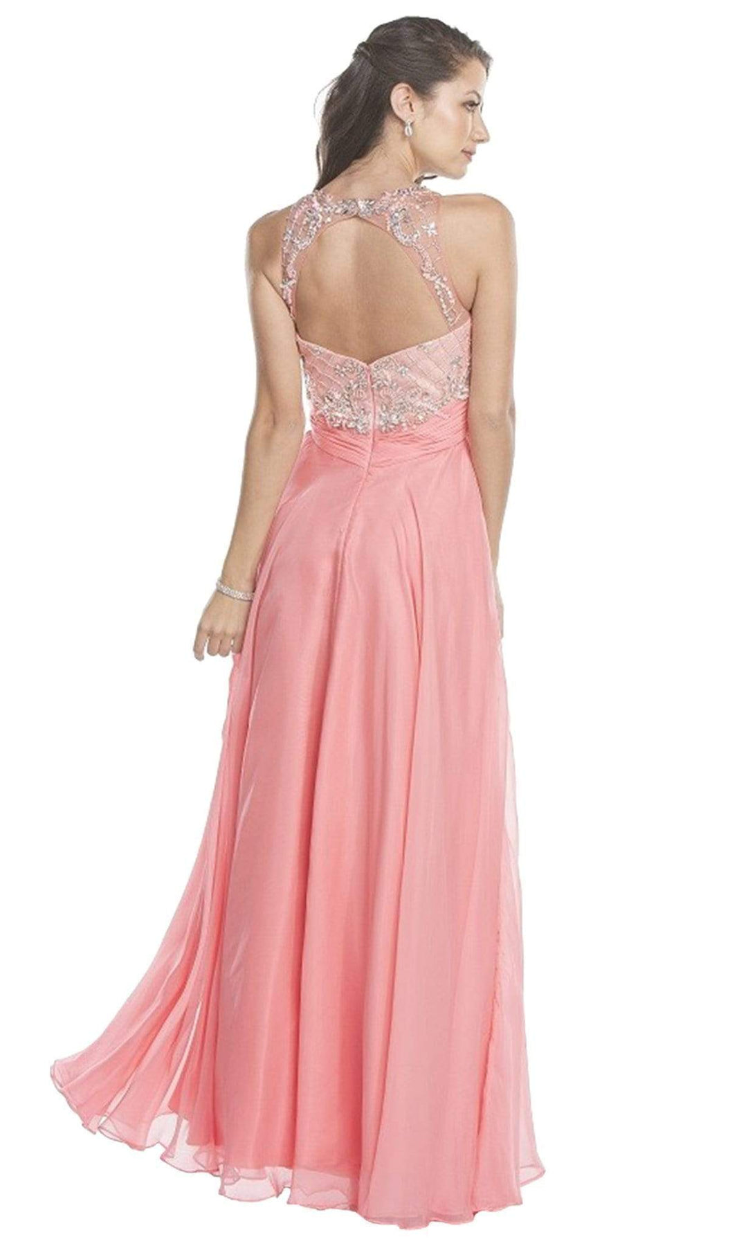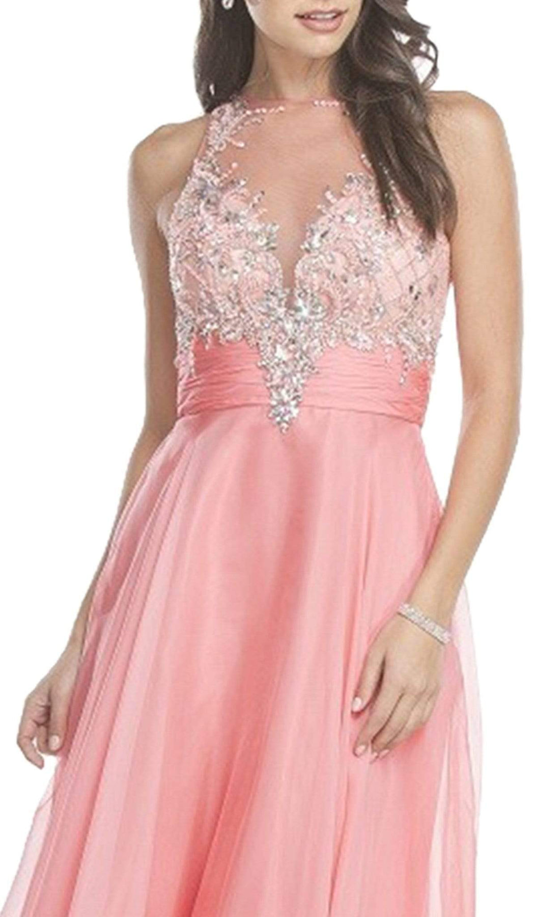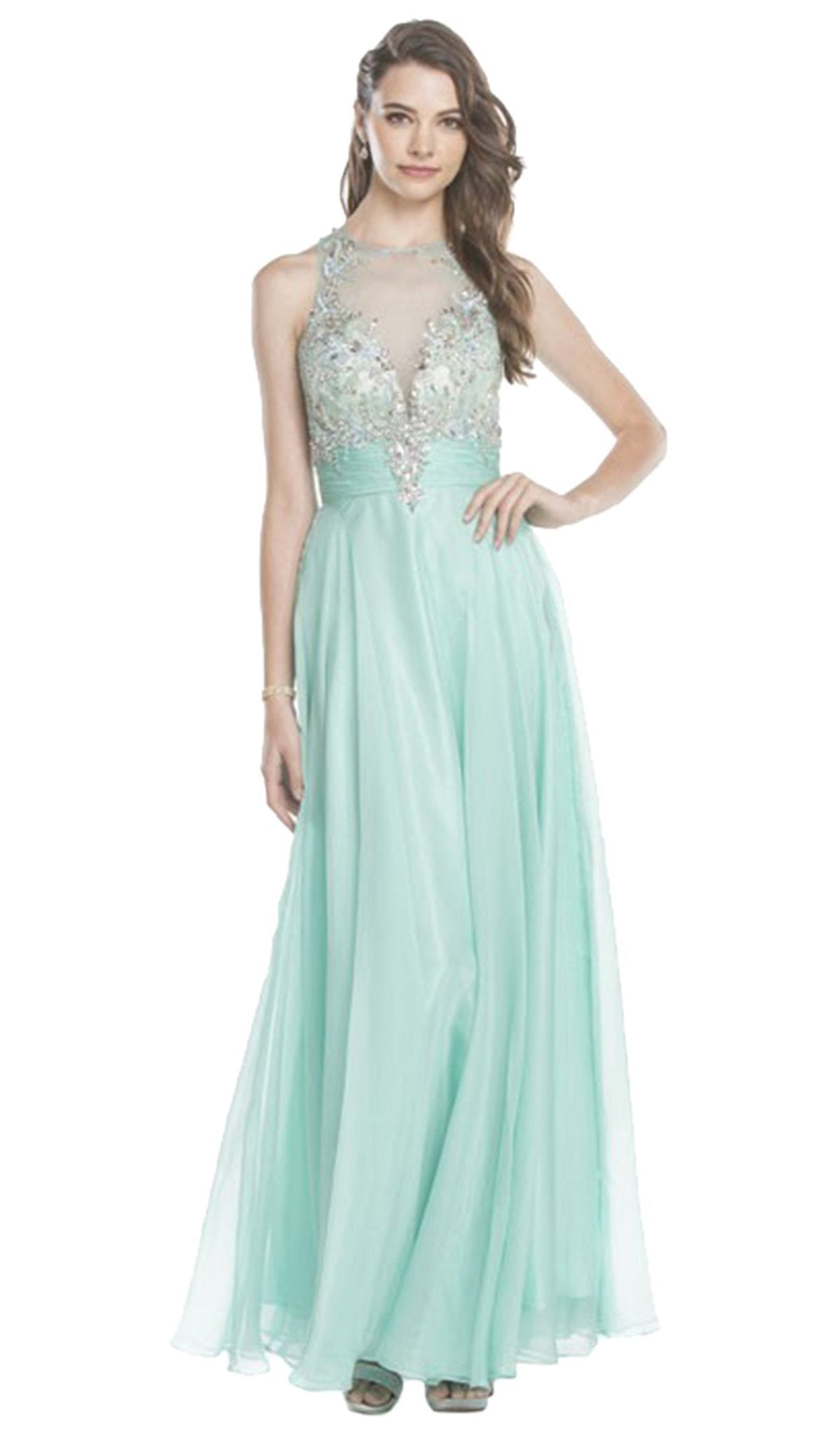 This on trend Trevi Collection L1419 prom dress will surely get you noticed on that special night. Extravagantly designed with sheer illusion neckline in lavishly embellished bodice, ruched waist band and ornately framed cut out back. This gorgeous design floats and flutters to the full-length. This Trevi Collection style is created to set your best foot forward to ensure you look and feel your very best on prom night. Models are wearing Coral, Mint, and Perry Blue colors.