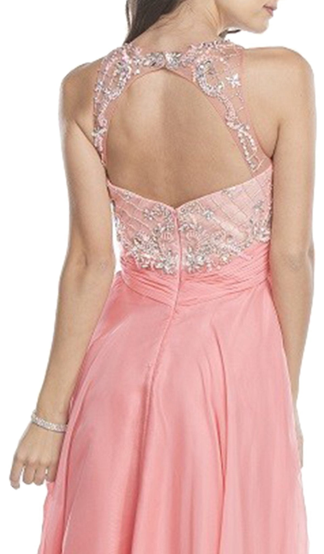 Details: | Sleeveless, Beaded, Sheer neckline, Ruched waistband, Back zipper closure |