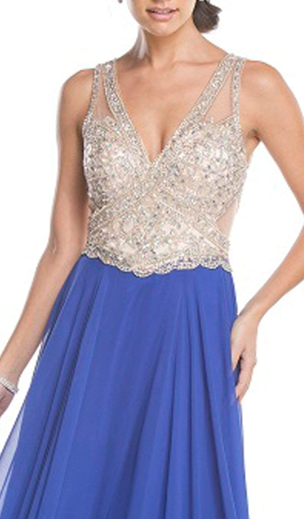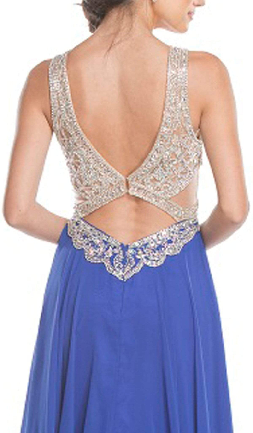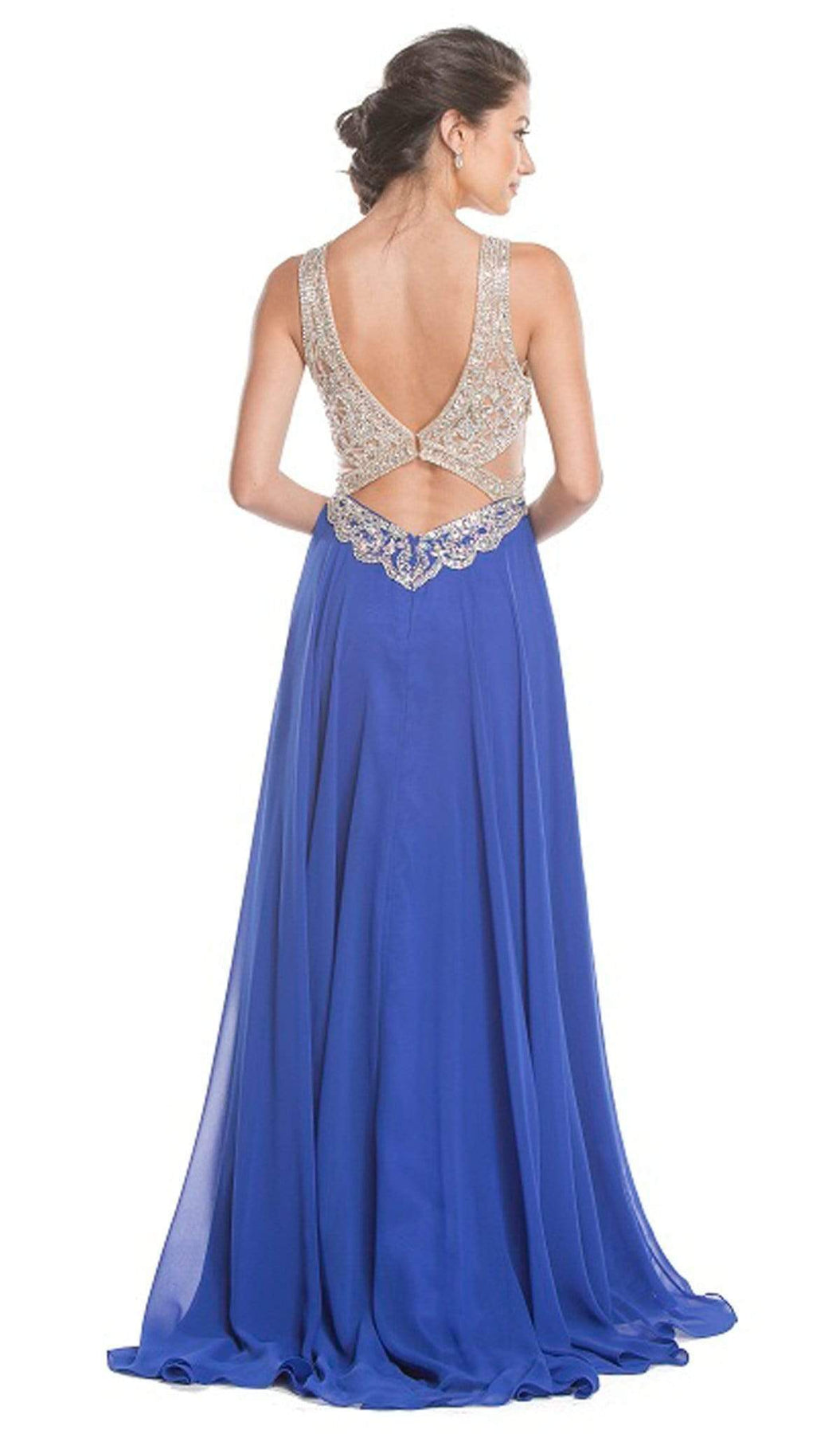 Be the lady of the night in this Trevi Collection L1640 creation. Encrusted with shimmering beadwork in an intricate pattern, this lovely sleeveless dress displays an illusion deep v-neckline and low v-open back with a diamond cutout design at the bottom. The flowy skirt forms an A-line silhouette as it glides to the full length hem and sweeping train. This Trevi Collection L1640 dress is awesome for prom or for any special night event! Model is wearing the Royal color.